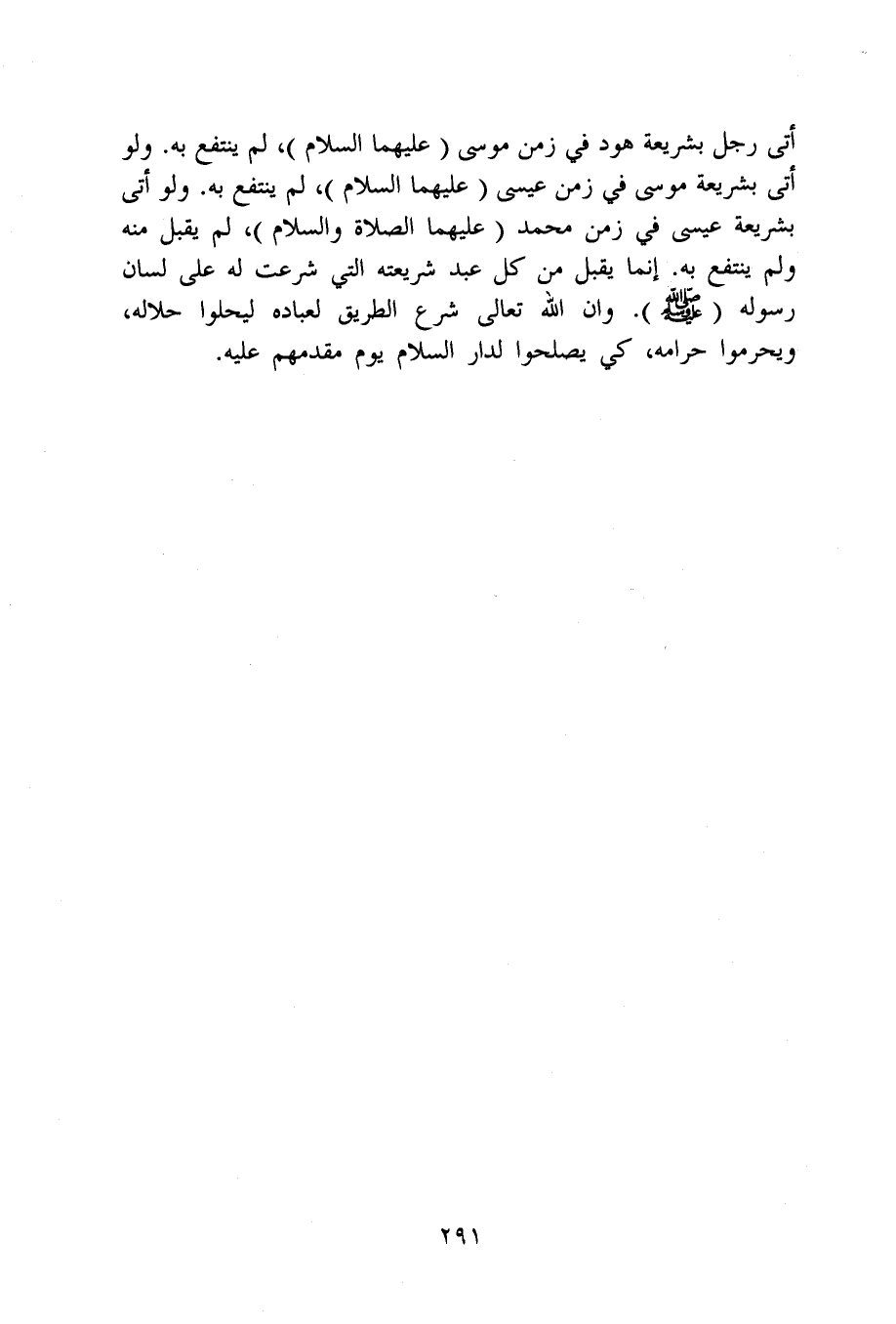 أَتَى رجل بشريعة هود فِي زمن مُوسَى عَلَيْهِمَا السَّلَام لم ينْتَفع بِهِ وَلَو أَتَى بشريعة مُوسَى فِي زمن عِيسَى عَلَيْهِمَا السَّلَام لم ينْتَفع بِهِ وَلَو أَتَى بشريعة عِيسَى فِي زمن مُحَمَّد عَلَيْهِمَا الصَّلَاة وَالسَّلَام لم يقبل مِنْهُ وَلم ينْتَفع بِهِ إِنَّمَا يقبل من كل عبد شَرِيعَته الَّتِي شرعت لَهُ على لِسَان رَسُوله صلى الله عَلَيْهِ وَسلم وان الله تَعَالَى شرع الطَّرِيق لِعِبَادِهِ ليحلوا حَلَاله ويحرموا حرَامه كي يصلحوا لدار السَّلَام يَوْم مقدمهم عَلَيْهِ