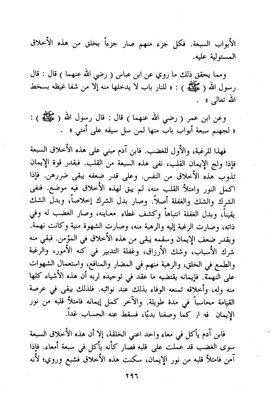 فَهَذِهِ للرغبة وَالْأول للغضب فَابْن آدم مَبْنِيّ على هَذِه الْأَخْلَاق السَّبْعَة فَإِذا ولج الْإِيمَان الْقلب نفى هَذِه السَّبْعَة من الْقلب فبقدر قُوَّة الْإِيمَان تذوب هَذِه الْأَخْلَاق من النَّفس وعَلى قدر ضعفه يبْقى ضررهن فَإِذا اكمل النُّور وامتلأ الْقلب مِنْهُ لم يبْق لهَذِهِ الْأَخْلَاق فِيهِ مَوضِع فنفى الشّرك وَالشَّكّ والغفلة أصلا وَصَارَ بدل الشّرك إخلاصا وَبدل الشَّك يَقِينا وَبدل الْغَفْلَة انتباها وكشف غطاء معاينه وَصَارَ الْغَضَب لَهُ وَفِي ذَاته وَصَارَت الرَّغْبَة إِلَيْهِ والرهبة مِنْهُ وَصَارَت الشَّهْوَة منية وَكَانَت نهمة وبقدر ضعف الْإِيمَان وسقمه يبْقى من هَذِه الْأَخْلَاق فِي الْمُؤمن فَبَقيَ مِنْهُ شرك الْأَسْبَاب وَشك الأرزاق وغفلة التَّدْبِير فِي كنه الْأُمُور وَالرَّغْبَة والطمع فِي الْخلق والرهبة مِنْهُم فِي المضار وَالْمَنَافِع وَاسْتِعْمَال الشَّهَوَات على النهمة فإيمانه يَقْتَضِيهِ مَا عقد فِي توحيده لرَبه أَن هَذِه الْأَشْيَاء كلهَا مِنْهُ وَله وأخلاقه تَمنعهُ الْوَفَاء بذلك عِنْد نوائبه فَلذَلِك يبْقى فِي عَرصَة الْقِيَامَة محاسبا فِي مُدَّة طَوِيلَة وَالْآخر كمل إيمَانه فَامْتَلَأَ قلبه من نور الْإِيمَان فَصَارَ كَمَا وَصفنَا بدءا فَسقط عَنهُ الْحساب غَدا