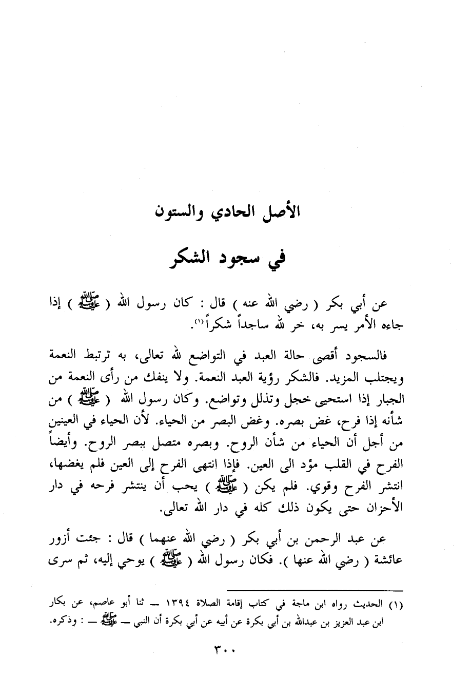 فالسجود أقْصَى حَالَة العَبْد فِي التَّوَاضُع لله تَعَالَى بِهِ ترتبط النِّعْمَة ويجتلب الْمَزِيد فالشكر رُؤْيَة العَبْد النِّعْمَة وَلَا يَنْفَكّ من رأى النِّعْمَة من الْجَبَّار إِذا استحيى خجل وتذلل وتواضع وَكَانَ رَسُول الله صلى الله عَلَيْهِ وَسلم من شَأْنه إِذا فَرح غض بَصَره وغض الْبَصَر من الْحيَاء لِأَن الْحيَاء فِي الْعَينَيْنِ من أجل أَن الْحيَاء من شَأْن الرّوح وبصره مُتَّصِل ببصر الرّوح وَأَيْضًا الْفَرح فِي الْقلب مؤد الى الْعين فَإِذا انْتهى الْفَرح إِلَى الْعين فَلم يغضها انْتَشَر الْفَرح وَقَوي فَلم يكن صلى الله عَلَيْهِ وَسلم يحب أَن ينتشر فرحه فِي دَار الأحزان حَتَّى يكون ذَلِك كُله فِي دَار الله تَعَالَى