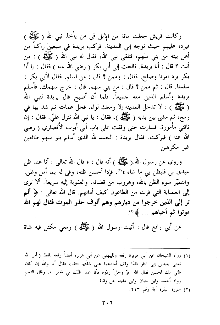 وَكَانَت قُرَيْش جعلت مائَة من الأبل فِي من يَأْخُذ نَبِي الله صلى الله عَلَيْهِ وَسلم فَيردهُ عَلَيْهِم حَيْثُ توجه إِلَى الْمَدِينَة فَركب بُرَيْدَة فِي سبعين رَاكِبًا من أهل بَيته من بني سهم فَتلقى نَبِي الله فَقَالَ لَهُ نَبِي الله صلى الله عَلَيْهِ وَسلم من أَنْت قَالَ أَنا بُرَيْدَة فَالْتَفت إِلَى أبي بكر رَضِي الله عَنهُ فَقَالَ يَا أَبَا بكر برد أمرنَا وَصلح فَقَالَ وَمِمَّنْ قَالَ من اسْلَمْ فَقَالَ لأبي بكر سلمنَا قَالَ ثمَّ مِمَّن قَالَ من بني سهم قَالَ خرج سهمك فَأسلم بريده وَأسلم الَّذين مَعَه جَمِيعًا فَلَمَّا أَن أصبح قَالَ بريده لنَبِيّ الله صلى الله عَلَيْهِ وَسلم لَا تدخل الْمَدِينَة إِلَّا ومعك لِوَاء فَحل عمَامَته ثمَّ شدّ بهَا فِي رمح ثمَّ مَشى بَين يَدَيْهِ صلى الله عَلَيْهِ وَسلم فَقَالَ يَا نَبِي الله تنزل عَليّ فَقَالَ إِن نَاقَتي مأمورة فسارت حَتَّى وقفت على بَاب أبي أَيُّوب الْأنْصَارِيّ رَضِي الله عَنهُ فبركت فَقَالَ بُرَيْدَة الْحَمد لله الَّذِي أسلم بَنو سهم طائعين غير مكرهين