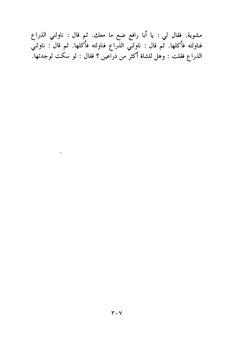 مشوية فَقَالَ لي يَا أَبَا رَافع ضع مَا مَعَك ثمَّ قَالَ ناولني الذِّرَاع فناولته فَأكلهَا ثمَّ قَالَ ناولني الذِّرَاع فناولته فَأكلهَا ثمَّ قَالَ ناولني الذِّرَاع فَقلت وَهل للشاة أَكثر من ذراعين فَقَالَ لَو سكت لوجدتها