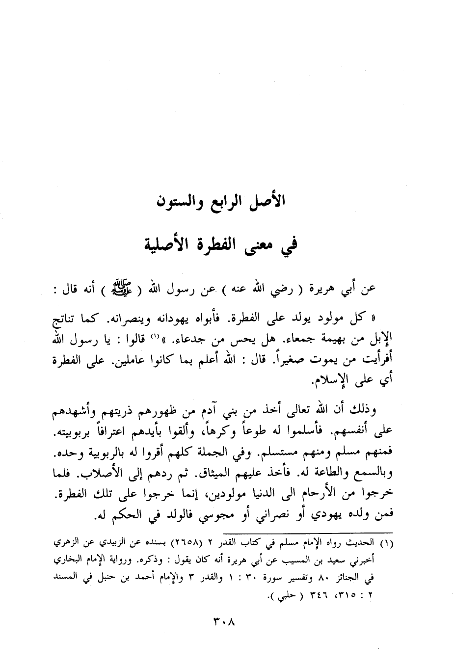 عَن أبي هُرَيْرَة رَضِي الله عَنهُ عَن رَسُول الله صلى الله عَلَيْهِ وَسلم أَنه قَالَ كل مَوْلُود يُولد على الْفطْرَة فَأَبَوَاهُ يُهَوِّدَانِهِ وَيُنَصِّرَانِهِ كَمَا تناتج الْإِبِل من بَهِيمَة جَمْعَاء هَل يحس من جَدْعَاء قَالُوا يَا رَسُول الله أَفَرَأَيْت من يَمُوت صَغِيرا قَالَ الله أعلم بِمَا كَانُوا عاملين على الْفطْرَة أَي على الْإِسْلَام