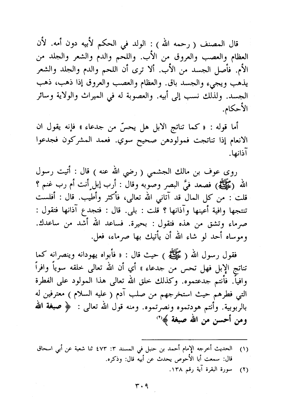 فَقَوْل رَسُول الله صلى الله عَلَيْهِ وَسلم حَيْثُ قَالَ فَأَبَوَاهُ يُهَوِّدَانِهِ وَيُنَصِّرَانِهِ كَمَا تناتج الْإِبِل فَهَل تحس من جدعا أَي أَن الله تَعَالَى خلقه سويا وافرا وافيا فَأنْتم جدعتموه وَكَذَلِكَ خلق الله تَعَالَى هَذَا الْمَوْلُود على الْفطْرَة الَّتِي فطرهم حَيْثُ استخرجهم من صلب آدم عَلَيْهِ السَّلَام معترفين لَهُ بالربوبية وَأَنْتُم هودتموه ونصرتموه وَمِنْه قَول الله تَعَالَى {صبغة الله وَمن أحسن من الله صبغة}