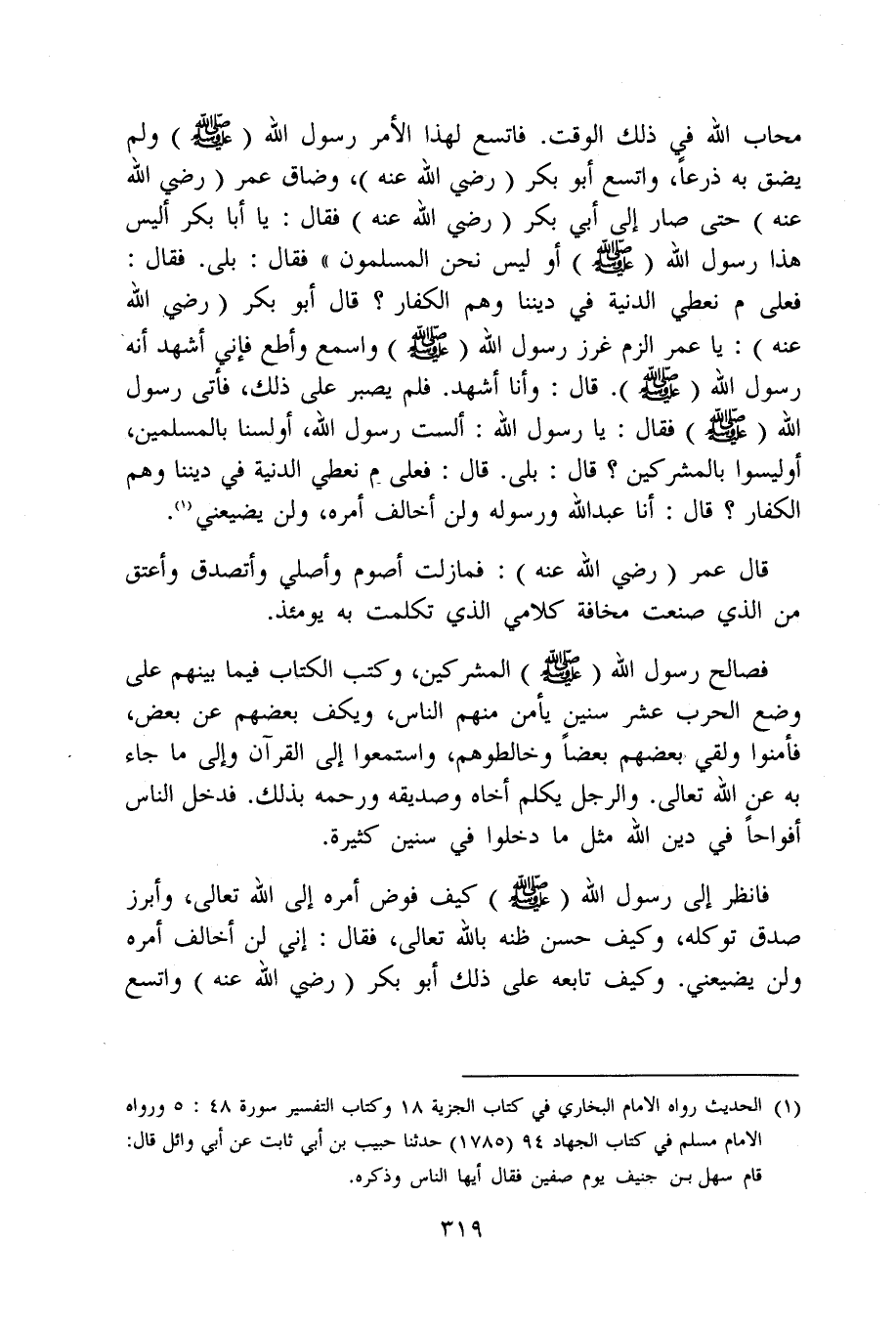 محاب الله فِي ذَلِك الْوَقْت فاتسع لهَذَا الْأَمر رَسُول الله صلى الله عَلَيْهِ وَسلم وَلم يضق بِهِ ذرعا واتسع أَبُو بكر رَضِي الله عَنهُ وضاق عمر رَضِي الله عَنهُ حَتَّى صَار إِلَى أبي بكر رَضِي الله عَنهُ فَقَالَ يَا أَبَا بكر أَلَيْسَ هَذَا رَسُول الله صلى الله عَلَيْهِ وَسلم أَو لَيْسَ نَحن الْمُسلمُونَ فَقَالَ بلَى فَقَالَ فعلى م نعطي الدنية فِي ديننَا وهم الْكفَّار قَالَ أَبُو بكر رَضِي الله عَنهُ يَا عمر الزم غرز رَسُول الله صلى الله عَلَيْهِ وَسلم واسمع وأطع فَإِنِّي أشهد أَنه رَسُول الله صلى الله عَلَيْهِ وَسلم قَالَ وَأَنا أشهد فَلم يصبر على ذَلِك فَأتى رَسُول الله صلى الله عَلَيْهِ وَسلم فَقَالَ يَا رَسُول الله أَلَسْت رَسُول الله أولسنا بِالْمُسْلِمين أوليسوا بالمشركين قَالَ بلَى قَالَ فعلى م نعطي الدنية فِي ديننَا وهم الْكفَّار قَالَ أَنا عبد الله وَرَسُوله وَلنْ أُخَالِف أمره وَلنْ يضيعني