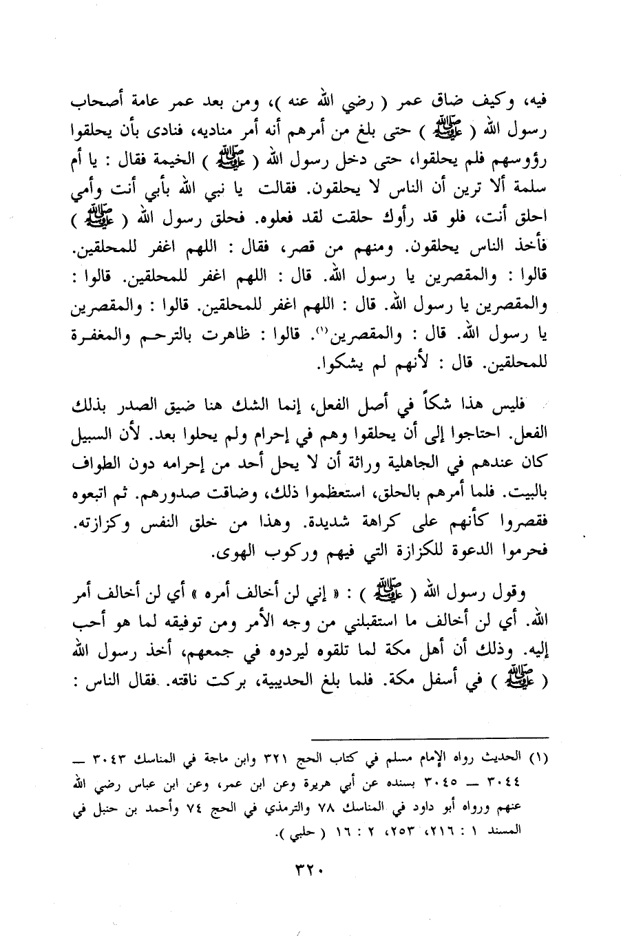 فِيهِ وَكَيف ضَاقَ عمر رَضِي الله عَنهُ وَمن بعد عمر عَامَّة أَصْحَاب رَسُول الله صلى الله عَلَيْهِ وَسلم حَتَّى بلغ من أَمرهم أَنه أَمر مناديه فَنَادَى بِأَن يحلقوا رؤوسهم فَلم يحلقوا حَتَّى دخل رَسُول الله صلى الله عَلَيْهِ وَسلم الْخَيْمَة فَقَالَ يَا أم سَلمَة أَلا تَرين أَن النَّاس لَا يحلقون فَقَالَت يَا نَبِي الله بِأبي أَنْت وَأمي احْلق أَنْت فَلَو قد رأوك حلقت لقد فَعَلُوهُ فحلق رَسُول الله صلى الله عَلَيْهِ وَسلم فَأخذ النَّاس يحلقون وَمِنْهُم من قصر فَقَالَ اللَّهُمَّ اغْفِر للمحلقين قَالُوا والمقصرين يَا رَسُول الله قَالَ اللَّهُمَّ اغْفِر للمحلقين قَالُوا والمقصرين يَا رَسُول الله قَالَ اللَّهُمَّ اغْفِر للمحلقين قَالُوا والمقصرين يَا رَسُول الله قَالَ والمقصرين قَالُوا ظَاهَرت بالترحم وَالْمَغْفِرَة للمحلقين قَالَ لأَنهم لم يشكوا