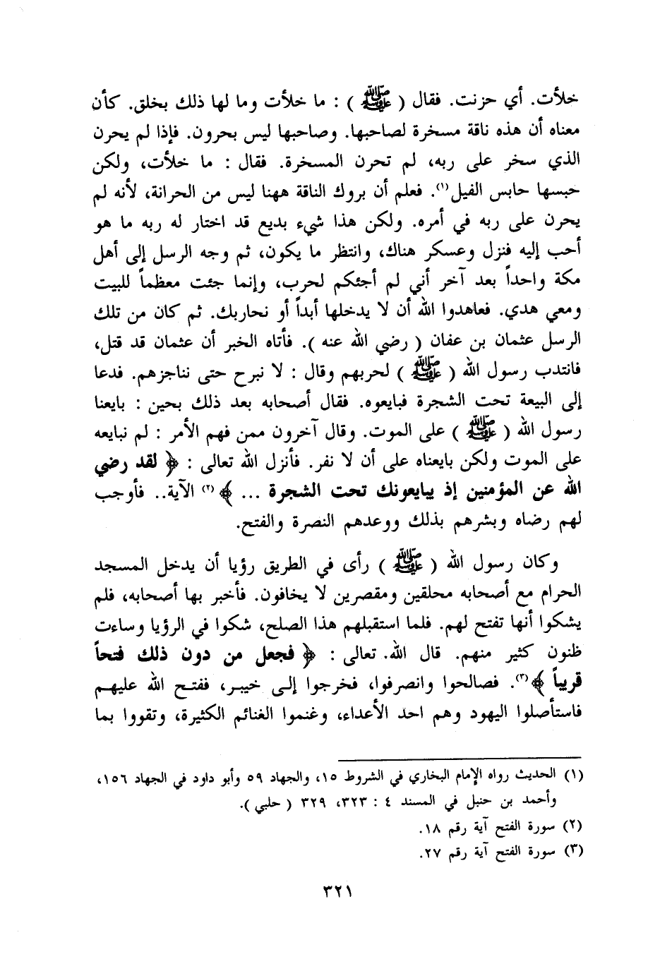 خلأت أَي حزنت فَقَالَ صلى الله عَلَيْهِ وَسلم مَا خلأت وَمَا لَهَا ذَلِك بِخلق كَأَن مَعْنَاهُ أَن هَذِه نَاقَة مسخرة لصَاحِبهَا وصاحبها لَيْسَ بحرون فَإِذا لم يحرن الَّذِي سخر على ربه لم تحرن المسخرة فَقَالَ مَا خلأت وَلَكِن حَبسهَا حَابِس الْفِيل فَعلم أَن بروك النَّاقة هَهُنَا لَيْسَ من الحرانة لِأَنَّهُ لم يحرن على ربه فِي أمره وَلَكِن هَذَا شَيْء بديع قد اخْتَار لَهُ ربه مَا هُوَ أحب إِلَيْهِ فَنزل وعسكر هُنَاكَ وانتظر مَا يكون ثمَّ وَجه الرُّسُل إِلَى أهل مَكَّة وَاحِدًا بعد آخر أَنِّي لم أجئكم لِحَرْب وَإِنَّمَا جِئْت مُعظما للبيت وَمَعِي هدي فعاهدوا الله أَن لَا يدخلهَا أبدا أَو نحاربك ثمَّ كَانَ من تِلْكَ الرُّسُل عُثْمَان بن عَفَّان رَضِي الله عَنهُ فَأَتَاهُ الْخَبَر أَن عُثْمَان قد قتل فَانْتدبَ رَسُول الله صلى الله عَلَيْهِ وَسلم لحربهم وَقَالَ لَا نَبْرَح حَتَّى نناجزهم فَدَعَا إِلَى الْبيعَة تَحت الشَّجَرَة فَبَايعُوهُ فَقَالَ أَصْحَابه بعد ذَلِك بِحِين بَايعنَا رَسُول الله صلى الله عَلَيْهِ وَسلم على الْمَوْت وَقَالَ آخَرُونَ مِمَّن فهم الْأَمر لم نُبَايِعهُ على الْمَوْت لَكِن بَايَعْنَاهُ على أَن لَا نفر فَأنْزل الله تَعَالَى {لقد رَضِي الله عَن الْمُؤمنِينَ إِذْ يُبَايعُونَك تَحت الشَّجَرَة} الْآيَة فَأوجب لَهُم رِضَاهُ وبشرهم بذلك وَوَعدهمْ النُّصْرَة وَالْفَتْح