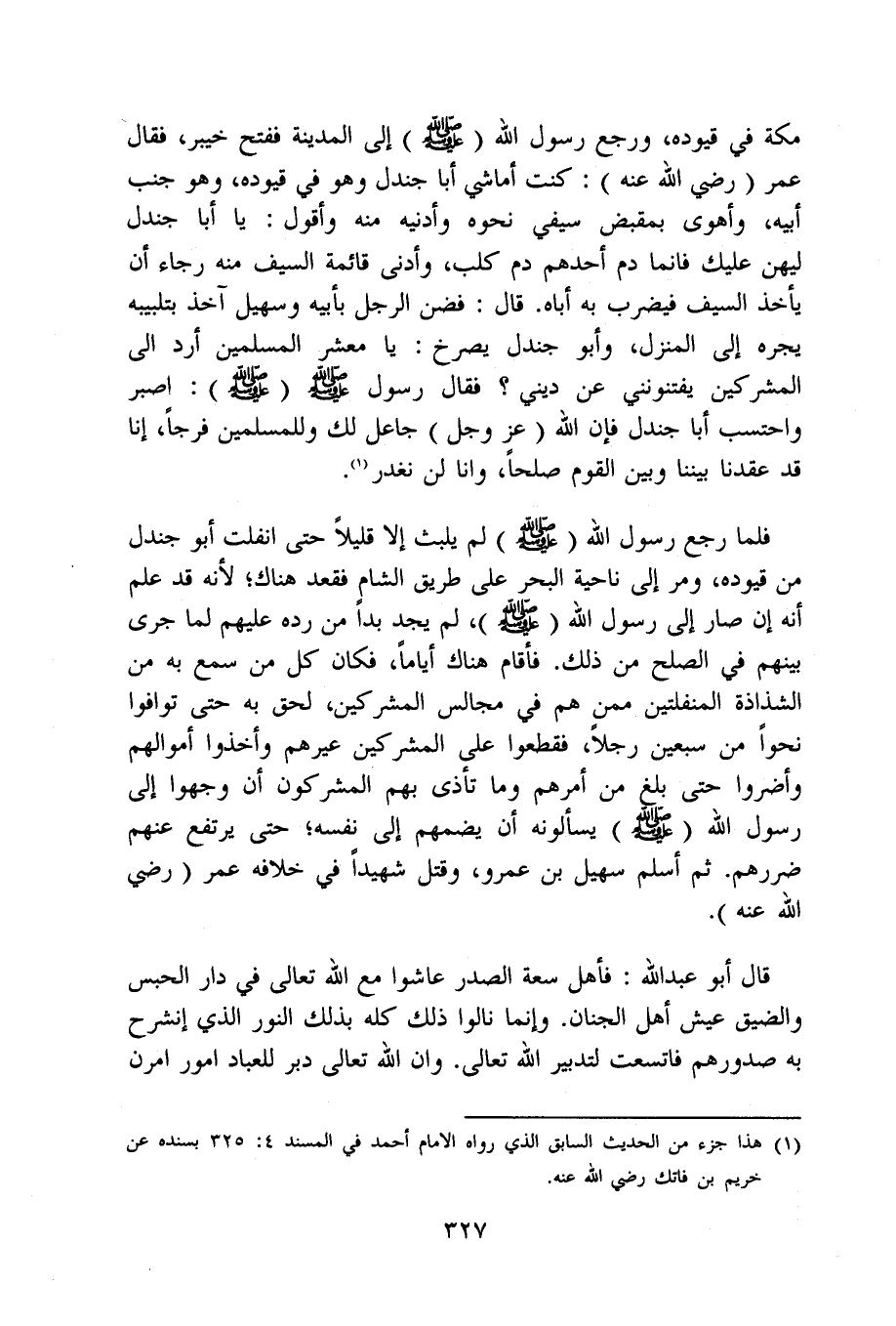 مَكَّة فِي قيوده وَرجع رَسُول الله صلى الله عَلَيْهِ وَسلم إِلَى الْمَدِينَة فَفتح خَيْبَر فَقَالَ عمر رَضِي الله عَنهُ كنت أماشي أَبَا جندل وَهُوَ فِي قيوده وَهُوَ جنب أَبِيه وأهوى بمقبض سَيفي نَحوه أدنيه مِنْهُ وَأَقُول يَا أَبَا جندل لِيهن عَلَيْك فانما دم أحدهم دم كلب وَأدنى قَائِمَة السَّيْف مِنْهُ رَجَاء أَن يَأْخُذ السَّيْف فَيضْرب بِهِ أَبَاهُ قَالَ فضن الرجل بِأَبِيهِ وَسُهيْل آخذ بتلبيبه يجره إِلَى الْمنزل وَأَبُو جندل يصْرخ يَا معشر الْمُسلمين أرد الى الْمُشْركين يفتنونني عَن ديني فَقَالَ رَسُول الله صلى الله عَلَيْهِ وَسلم اصبر واحتسب أَبَا جندل فَإِن الله عز وَجل جَاعل لَك وللمسلمين فرجا إِنَّا قد عَقدنَا بَيْننَا وَبَين الْقَوْم صلحا وانا لن نغدر