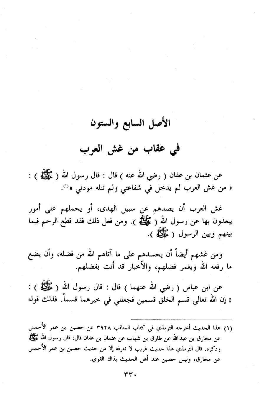 عَن عُثْمَان بن عَفَّان رَضِي الله عَنهُ قَالَ قَالَ رَسُول الله صلى الله عَلَيْهِ وَسلم من غش الْعَرَب لم يدْخل فِي شَفَاعَتِي وَلم تنله مودتي
