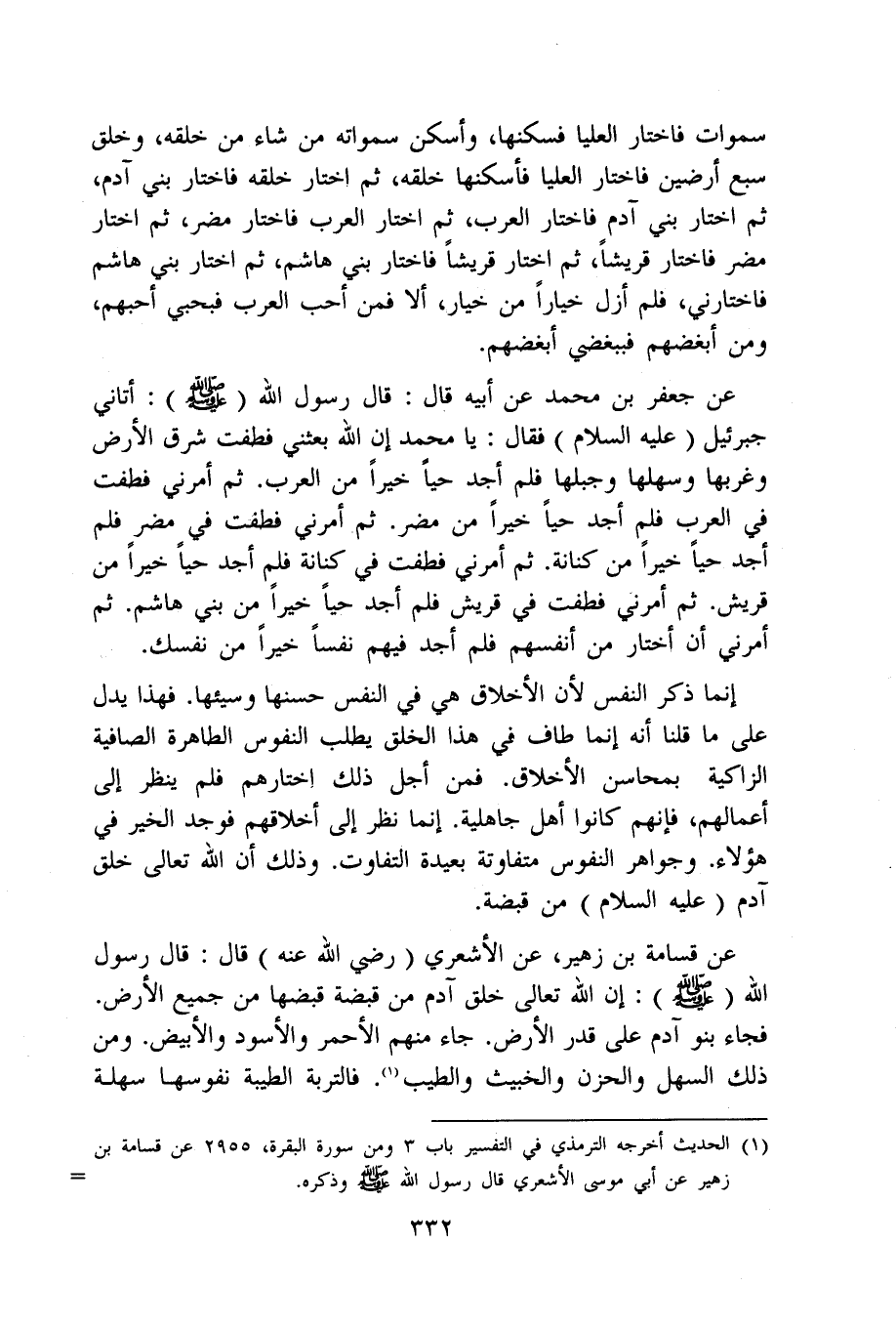 عَن قسَامَة بن زُهَيْر عَن الْأَشْعَرِيّ رَضِي الله عَنهُ قَالَ قَالَ رَسُول الله صلى الله عَلَيْهِ وَسلم إِن الله تَعَالَى خلق آدم من قَبْضَة قبضهَا من جَمِيع الأَرْض فجَاء بَنو آدم على قدر الأَرْض جَاءَ مِنْهُم الْأَحْمَر وَالْأسود والأبيض وَمن ذَلِك السهل والحزن والخبيث وَالطّيب فالتربة الطّيبَة نفوسها سهلة