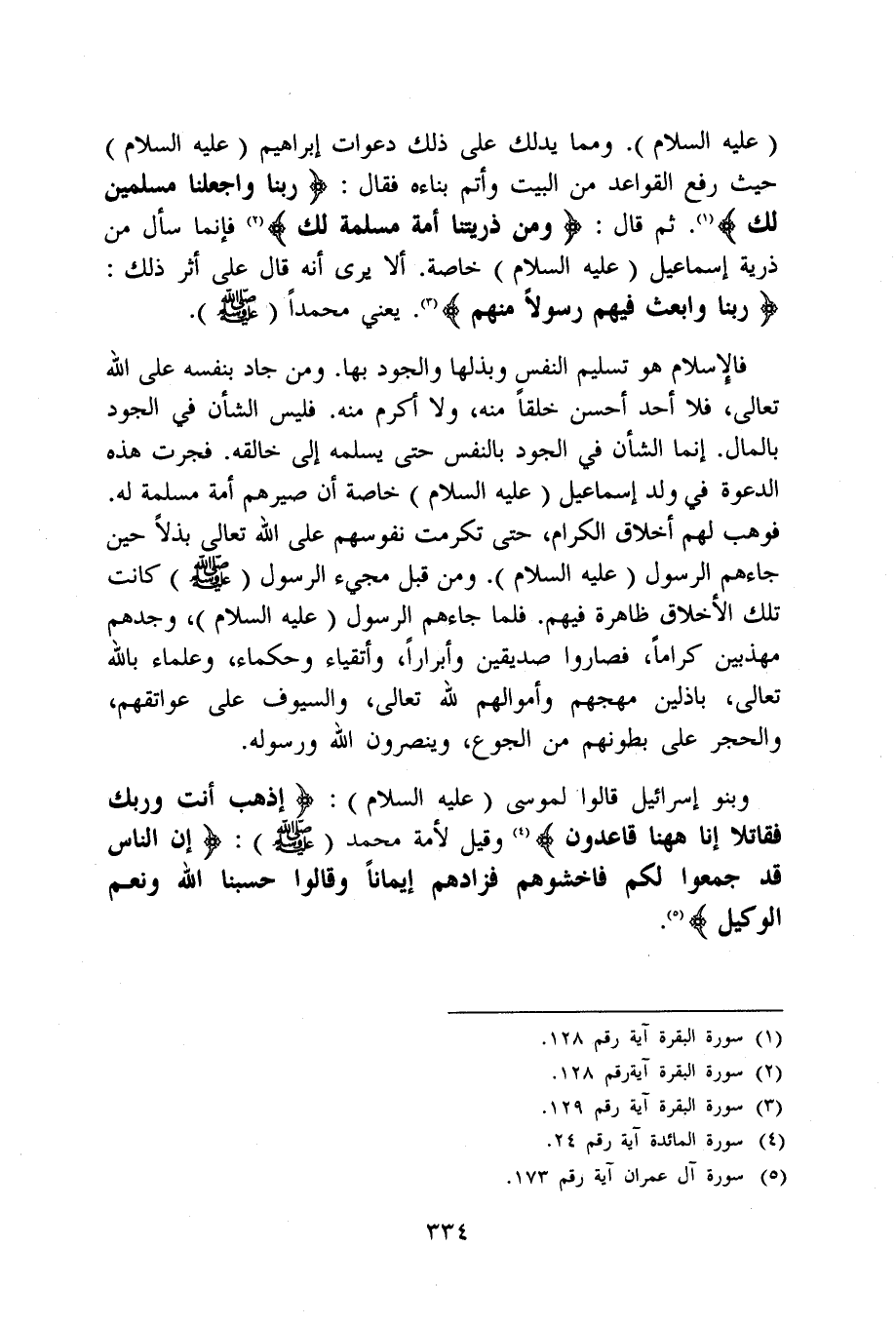 فالإسلام هُوَ تَسْلِيم النَّفس وبذلها والجود بهَا وَمن جاد بِنَفسِهِ على الله تَعَالَى فَلَا أحد أحسن خلقا مِنْهُ وَلَا أكْرم مِنْهُ فَلَيْسَ الشَّأْن فِي الْجُود بِالْمَالِ إِنَّمَا الشَّأْن فِي الْجُود بِالنَّفسِ حَتَّى يُسلمهُ إِلَى خالقه فجرت هَذِه الدعْوَة فِي ولد إِسْمَاعِيل عَلَيْهِ السَّلَام خَاصَّة أَن صيرهم أمة مسلمة لَهُ فوهب لَهُم أَخْلَاق الْكِرَام حَتَّى تكرمت نُفُوسهم على الله تَعَالَى بذلا حِين جَاءَهُم الرَّسُول عَلَيْهِ السَّلَام وَمن قبل مَجِيء الرَّسُول صلى الله عَلَيْهِ وَسلم كَانَت تِلْكَ الْأَخْلَاق ظَاهِرَة فيهم فَلَمَّا جَاءَهُم الرَّسُول عَلَيْهِ السَّلَام وجدهم مهذبين كراما فصاروا صديقين وأبرارا وأتقياء وحكماء وعلماء بِاللَّه تَعَالَى باذلين مهجهم وَأَمْوَالهمْ لله تَعَالَى وَالسُّيُوف على عواتقهم وَالْحجر على بطونهم من الْجُوع وينصرون الله وَرَسُوله