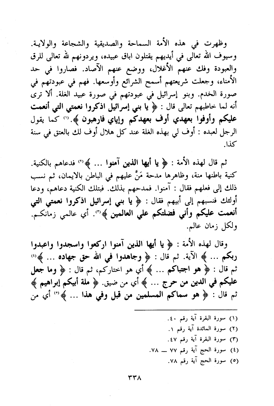 وَظَهَرت فِي هَذِه الْأمة السماحة والصديقية والشجاعة وَالْولَايَة وسيوف الله تَعَالَى فِي أَيْديهم يقتلُون اباق عبيده ويردونهم لله تَعَالَى للرق والعبودة وَفك عَنْهُم الأغلال وَوضع عَنْهُم الآصاد فصاروا فِي حد الْأُمَنَاء وَجعلت شريعتهم أسمح الشَّرَائِع وأوسعها فهم فِي عبودتهم فِي صُورَة الخدم وَبَنُو إِسْرَائِيل فِي عبودتهم فِي صُورَة عبيد الْغلَّة أَلا ترى أَنه لما خاطبهم تَعَالَى قَالَ يَا بني إِسْرَائِيل اذْكروا نعمتي الَّتِي أَنْعَمت عَلَيْكُم وأوفوا بعهدي أوف بعهدكم وَإِيَّاك فارهبون كَمَا يَقُول الرجل لعَبْدِهِ أوف لي بِهَذِهِ الْغلَّة عِنْد كل هِلَال أوف لَك بِالْعِتْقِ فِي سنة كَذَا