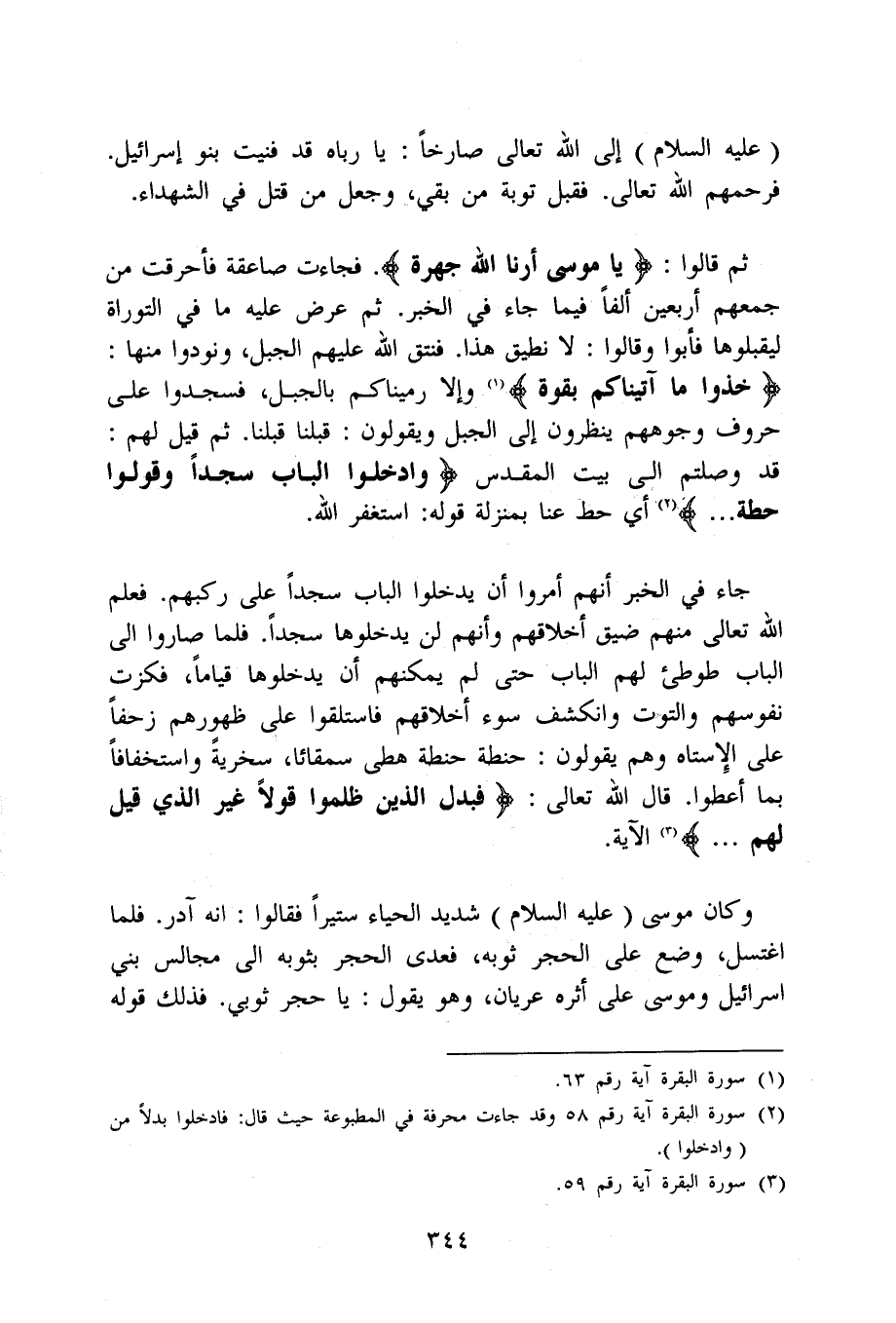 ثمَّ قَالُوا يَا مُوسَى أرنا الله جهرة فَجَاءَت صَاعِقَة فأحرقت من جمعهم أَرْبَعِينَ ألفا فِيمَا جَاءَ فِي الْخَبَر ثمَّ عرض عَلَيْهِ مَا فِي التَّوْرَاة ليقبلوها فَأَبُو وَقَالُوا لَا نطيق هَذَا فنتق الله عَلَيْهِم الْجَبَل ونودوا مِنْهَا خُذُوا مَا آتيناكم بِقُوَّة وَإِلَّا رميناكم بِالْجَبَلِ فسجدوا على حُرُوف وُجُوههم ينظرُونَ إِلَى الْجَبَل وَيَقُولُونَ قبلنَا قبلنَا ثمَّ قيل لَهُم قد وصلتم الى بَيت الْمُقَدّس وادخلوا الْبَاب سجدا وَقُولُوا حطة أَي حط عَنَّا بِمَنْزِلَة قَوْله اسْتغْفر الله