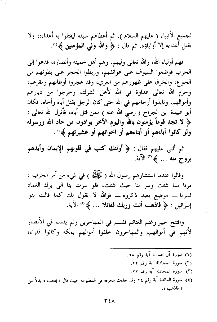 فهم أَوْلِيَاء الله وَالله تَعَالَى وليهم وهم أهل حميته وأنصاره فدعوا إِلَى الْحَرْب فوضعوا السيوف على عواتقهم وربطوا الْحجر على بطونهم من الْجُوع والخرق على ظُهُورهمْ من العري وَقد هجروا أوطانهم ومقرهم وَحرم الله تَعَالَى عَدَاوَة فِي الله لأهل الشّرك وَخَرجُوا من دِيَارهمْ وَأَمْوَالهمْ ونابذوا أرحامهم فِي الله حَتَّى كَانَ الرجل يقتل أَبَاهُ وأخاه فَكَانَ أَبُو عُبَيْدَة بن الْجراح رَضِي الله عَنهُ مِمَّن قتل أَبَاهُ فَأنْزل الله تَعَالَى {لَا تَجِد قوما يُؤمنُونَ بِاللَّه وَالْيَوْم الآخر يوادون من حاد الله وَرَسُوله وَلَو كَانُوا آبَاءَهُم أَو أَبْنَاءَهُم أَو إخْوَانهمْ أَو عشيرتهم}
