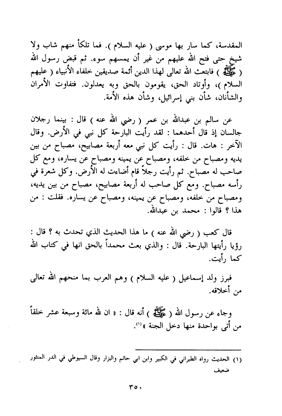 عَن سَالم بن عبد الله بن عمر رَضِي الله عَنهُ قَالَ بَيْنَمَا رجلَانِ جالسان إِذْ قَالَ أَحدهمَا لقد رَأَيْت البارحة كل نَبِي فِي الأَرْض وَقَالَ آلاخر هَات قَالَ رَأَيْت كل نَبِي مَعَه أَرْبَعَة مصابيح مِصْبَاح من بَين يَدَيْهِ ومصباح من خَلفه ومصباح عَن يَمِينه ومصباح عَن يسَاره وَمَعَ كل صَاحب لَهُ مِصْبَاح ثمَّ رَأَيْت رجلا قَامَ أَضَاءَت لَهُ الأَرْض وكل شَعْرَة فِي رَأسه مِصْبَاح وَمَعَ كل صَاحب لَهُ أَرْبَعَة مصابيح مِصْبَاح من بَين يَدَيْهِ ومصباح من خَلفه ومصباح عَن يَمِينه ومصباح عَن يسَاره فَقلت من هَذَا قَالُوا مُحَمَّد بن عبد الله