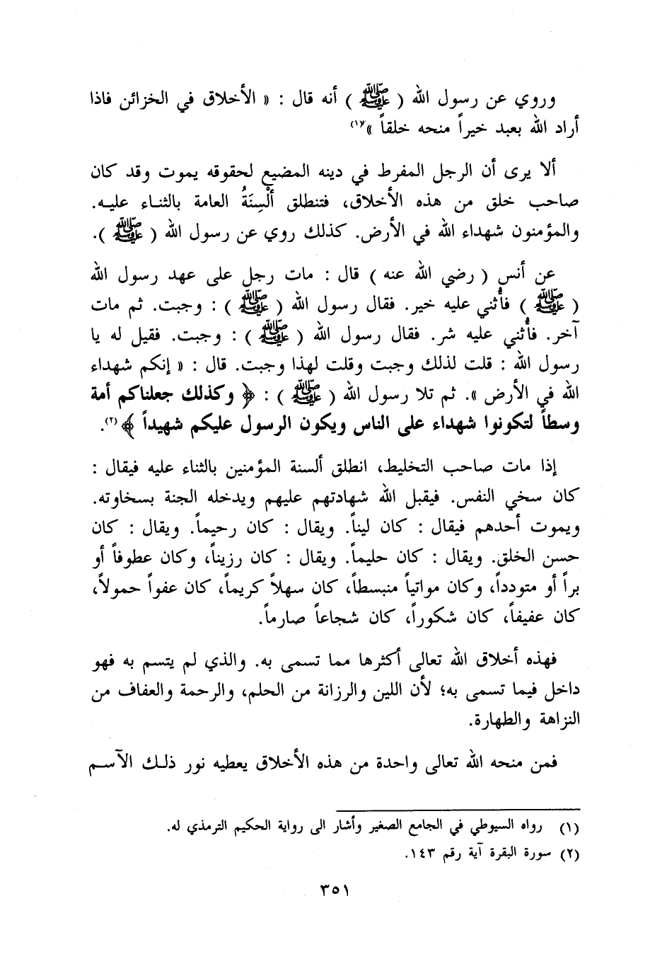 أَلا يرى أَن الرجل المفرط فِي دينه المضيع لحقوقه يَمُوت وَقد كَانَ صَاحب خلق من هَذِه الْأَخْلَاق فتنطلق أَلْسِنَة الْعَامَّة بالثناء عَلَيْهِ والمؤمنون شُهَدَاء الله فِي الأَرْض كَذَلِك رُوِيَ عَن رَسُول الله صلى الله عَلَيْهِ وَسلم