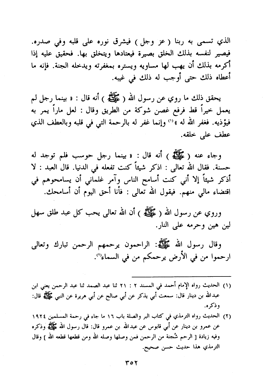 وَقَالَ رَسُول الله صلى الله عَلَيْهِ وَسلم الراحمون يرحمهم الرَّحْمَن تبَارك وَتَعَالَى ارحموا من فِي الأَرْض يَرْحَمكُمْ من فِي السَّمَاء
