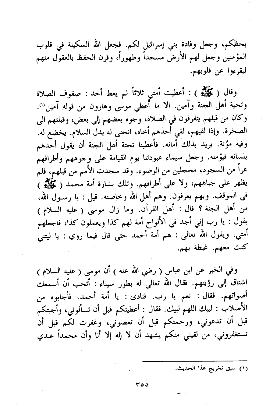 وَفِي الْخَبَر عَن ابْن عَبَّاس رَضِي الله عَنهُ أَن مُوسَى عَلَيْهِ السَّلَام اشتاق إِلَى رُؤْيَتهمْ فَقَالَ الله تَعَالَى لَهُ بطور سيناء أَتُحِبُّ أَن أسمعك أَصْوَاتهم فَقَالَ نعم يَا رب فَنَادَى يَا أمة أَحْمد فَأَجَابُوهُ من الأصلاب لبيْك اللَّهُمَّ لبيْك فَقَالَ أَعطيتكُم قبل أَن تَسْأَلُونِي وأجبتكم قبل أَن تَدعُونِي ورحمتكم قبل أَن تعصوني وغفرت لكم قبل أَن تستغفروني من لَقِيَنِي مِنْكُم يشْهد ان لَا إِلَه إِلَّا أَنا وَأَن مُحَمَّدًا عَبدِي