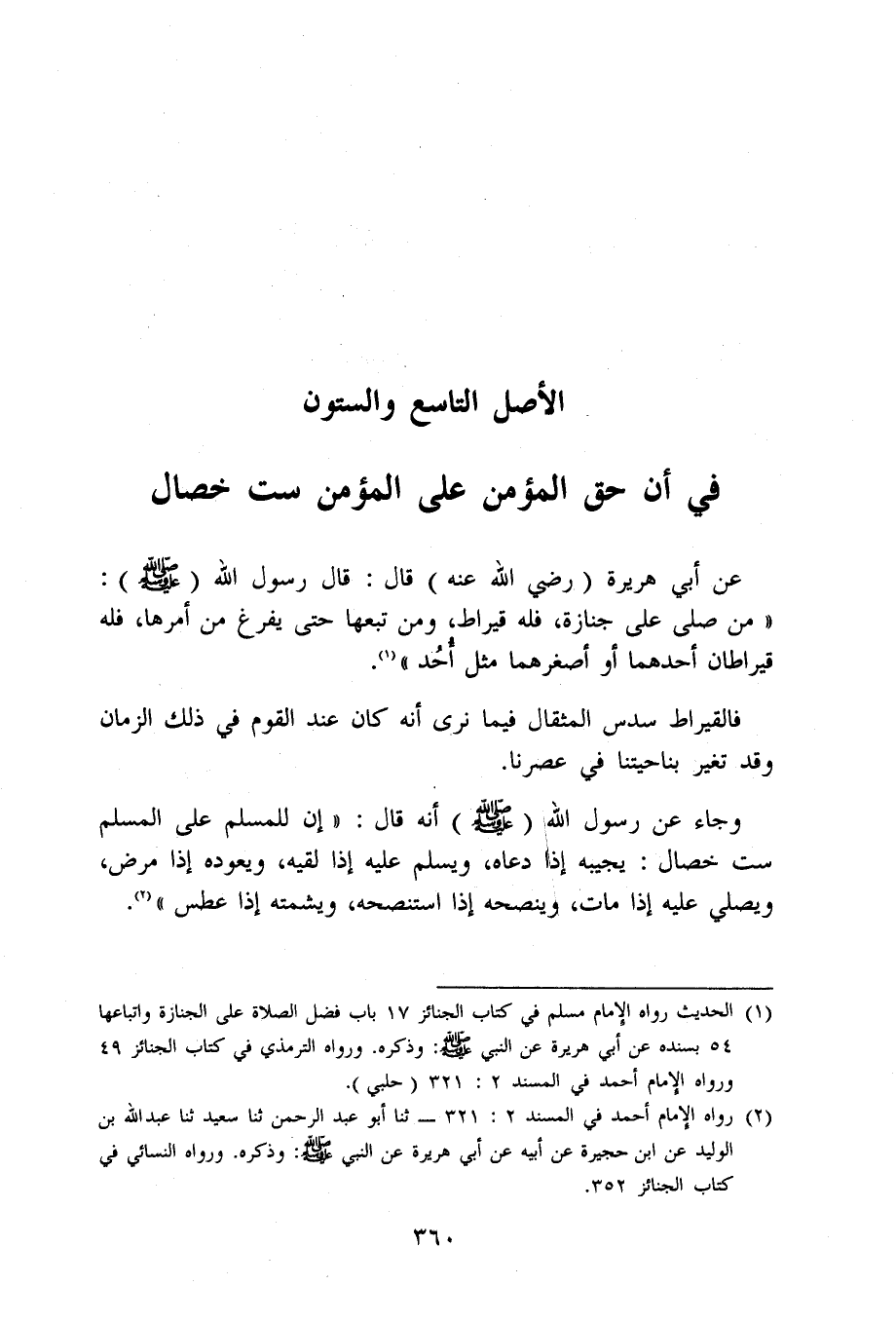 وَجَاء عَن رَسُول الله صلى الله عَلَيْهِ وَسلم أَنه قَالَ إِن للْمُسلمِ على الْمُسلم سِتّ خِصَال يجِيبه إِذا دَعَاهُ وَيسلم عَلَيْهِ إِذا لقِيه ويعوده إِذا مرض وَيُصلي عَلَيْهِ إِذا مَاتَ وينصحه إِذا استنصحه ويشمته إِذا عطس