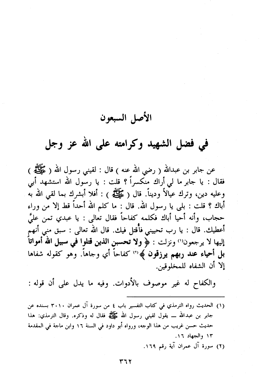 عَن جَابر بن عبد الله رَضِي الله عَنهُ قَالَ لَقِيَنِي رَسُول الله صلى الله عَلَيْهِ وَسلم فَقَالَ يَا جَابر مَا لي أَرَاك منكسرا قلت يَا رَسُول الله اسْتشْهد أبي وَعَلِيهِ دين وَترك عيالا ودينا قَالَ صلى الله عَلَيْهِ وَسلم أَفلا أُبَشِّرك بِمَا لَقِي الله بِهِ أَبَاك قلت بلَى يَا رَسُول الله قَالَ مَا كلم الله أحدا قطّ إِلَّا من وَرَاء حجاب وَأَنه أَحْيَا أَبَاك فَكَلمهُ كفاحا فَقَالَ تَعَالَى يَا عَبدِي تمن عَليّ أُعْطِيك قَالَ يَا رب تحييني فأقتل فِيك قَالَ الله تَعَالَى سبق مني أَنهم إِلَيْهَا لَا يرجعُونَ وَنزلت وَلَا تحسبن الَّذين قتلوا فِي سَبِيل الله أَمْوَاتًا بل أَحيَاء عِنْد رَبهم يرْزقُونَ كفاحا أَي وجاها وَهُوَ كَقَوْلِه شفاها إِلَّا أَن الشفاه للمخلوقين