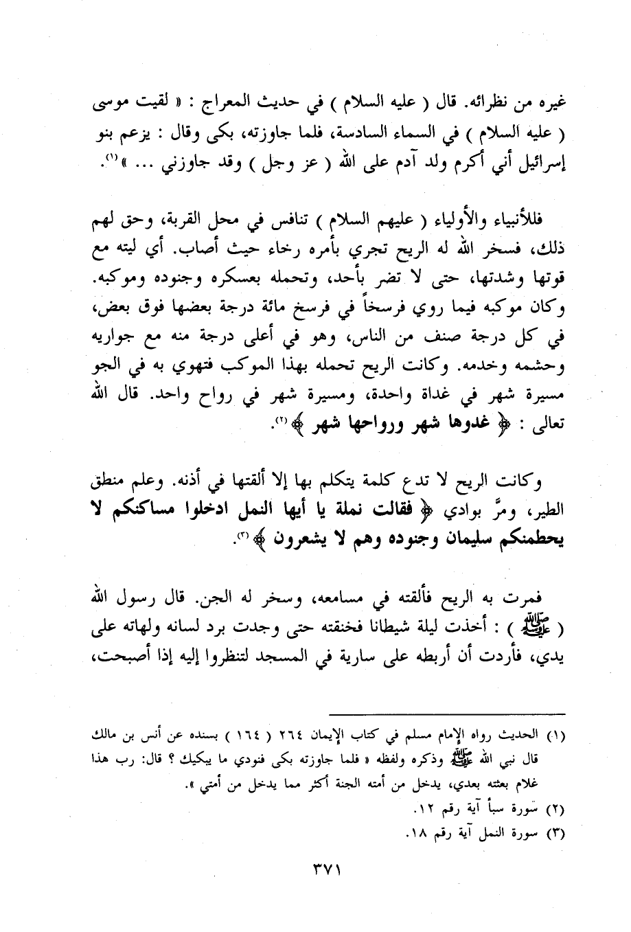 وَكَانَت الرّيح لَا تدع كلمة يتَكَلَّم بهَا إِلَّا ألقتها فِي إِذْنه وَعلم منطق الطير وَمر بوادي فَقَالَت نملة يَا أَيهَا النَّمْل ادخُلُوا مَسَاكِنكُمْ لَا يحطمنكم سُلَيْمَان وَجُنُوده وهم لَا يَشْعُرُونَ