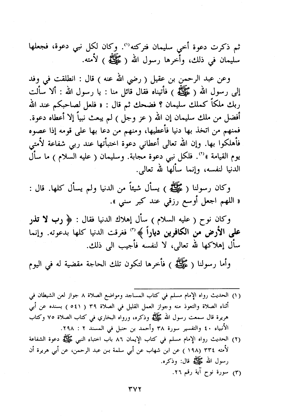 ثمَّ ذكرت دَعْوَة أخي سُلَيْمَان فتركته وَكَانَ لكل نَبِي دَعْوَة فَجَعلهَا سُلَيْمَان فِي ذَلِك وأخرها رَسُول الله صلى الله عَلَيْهِ وَسلم لأمته