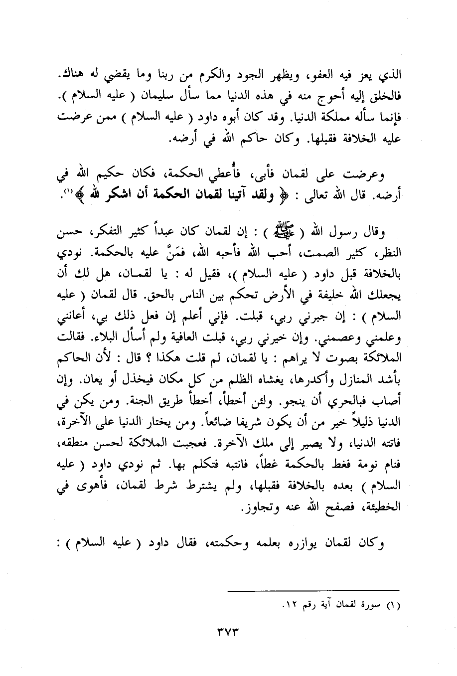 وَقَالَ رَسُول الله صلى الله عَلَيْهِ وَسلم إِن لُقْمَان كَانَ عبدا كثير التفكر حسن النّظر كثير الصمت أحب الله فَأَحبهُ الله فَمن عَلَيْهِ بالحكمة نُودي بالخلافة قبل دَاوُد عَلَيْهِ السَّلَام فَقيل لَهُ يَا لُقْمَان هَل لَك أَن يجعلك الله خَليفَة فِي الأَرْض تحكم بَين النَّاس بِالْحَقِّ قَالَ لُقْمَان عَلَيْهِ السَّلَام إِن جبرني رَبِّي قبلت فَإِنِّي أعلم إِن فعل ذَلِك بِي أعانني وَعَلمنِي وعصمني وَإِن خيرني رَبِّي قبلت الْعَافِيَة وَلم أسأَل الْبلَاء فَقَالَت الْمَلَائِكَة بِصَوْت لَا يراهم يَا لُقْمَان لم قلت هَكَذَا قَالَ لِأَن الْحَاكِم بأشد الْمنَازل وأكدرها يَغْشَاهُ الظُّلم من كل مَكَان فيخذل أَو يعان وَإِن أصَاب فبالحري أَن ينجو وَلَئِن أَخطَأ أَخطَأ طَرِيق الْجنَّة وَمن يكن فِي الدُّنْيَا ذليلا خير من أَن يكون شريفا ضائعا وَمن يخْتَار الدُّنْيَا على الْآخِرَة فَاتَتْهُ الدُّنْيَا وَلَا يصير إِلَى ملك الْآخِرَة فعجبت الْمَلَائِكَة لحسن مَنْطِقه فَنَامَ نومَة فغط بالحكمة غطا فانتبه فَتكلم بهَا ثمَّ نُودي دَاوُد عَلَيْهِ السَّلَام بعده بالخلافة فقبلها وَلم يشْتَرط شَرط لُقْمَان فَأَهوى فِي الْخَطِيئَة فصفح الله عَنهُ وَتجَاوز