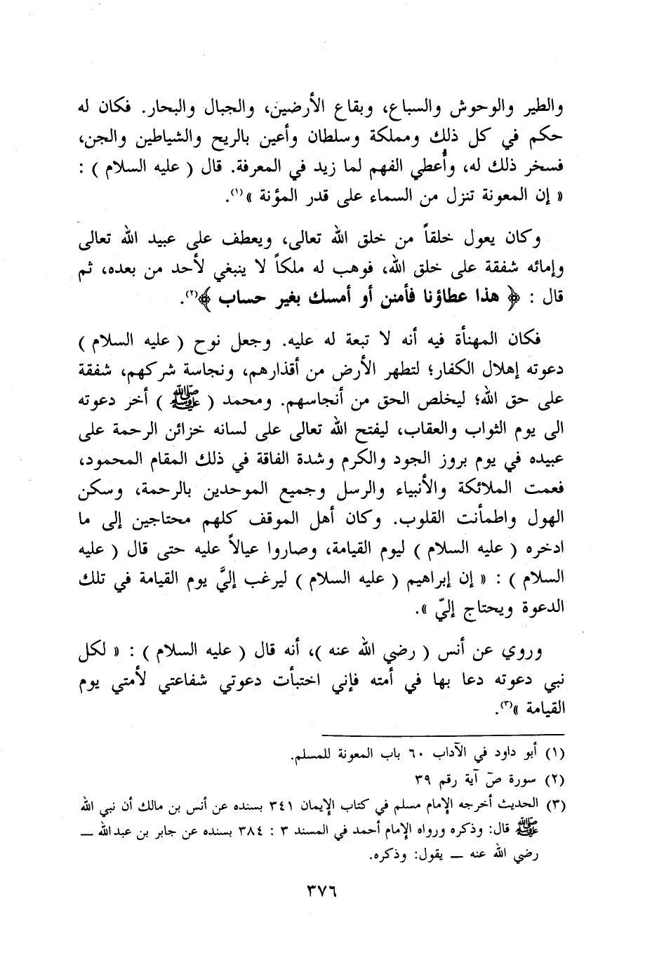 وَالطير والوحوش وَالسِّبَاع وبقاع الْأَرْضين وَالْجِبَال والبحار فَكَانَ لَهُ حكم فِي كل ذَلِك ومملكة وسلطان وأعين بِالرِّيحِ وَالشَّيَاطِين وَالْجِنّ فَسخرَ ذَلِك لَهُ وَأعْطِي الْفَهم لما زيد فِي الْمعرفَة قَالَ عَلَيْهِ السَّلَام إِن المعونة تنزل من السَّمَاء على قدر الْمُؤْنَة