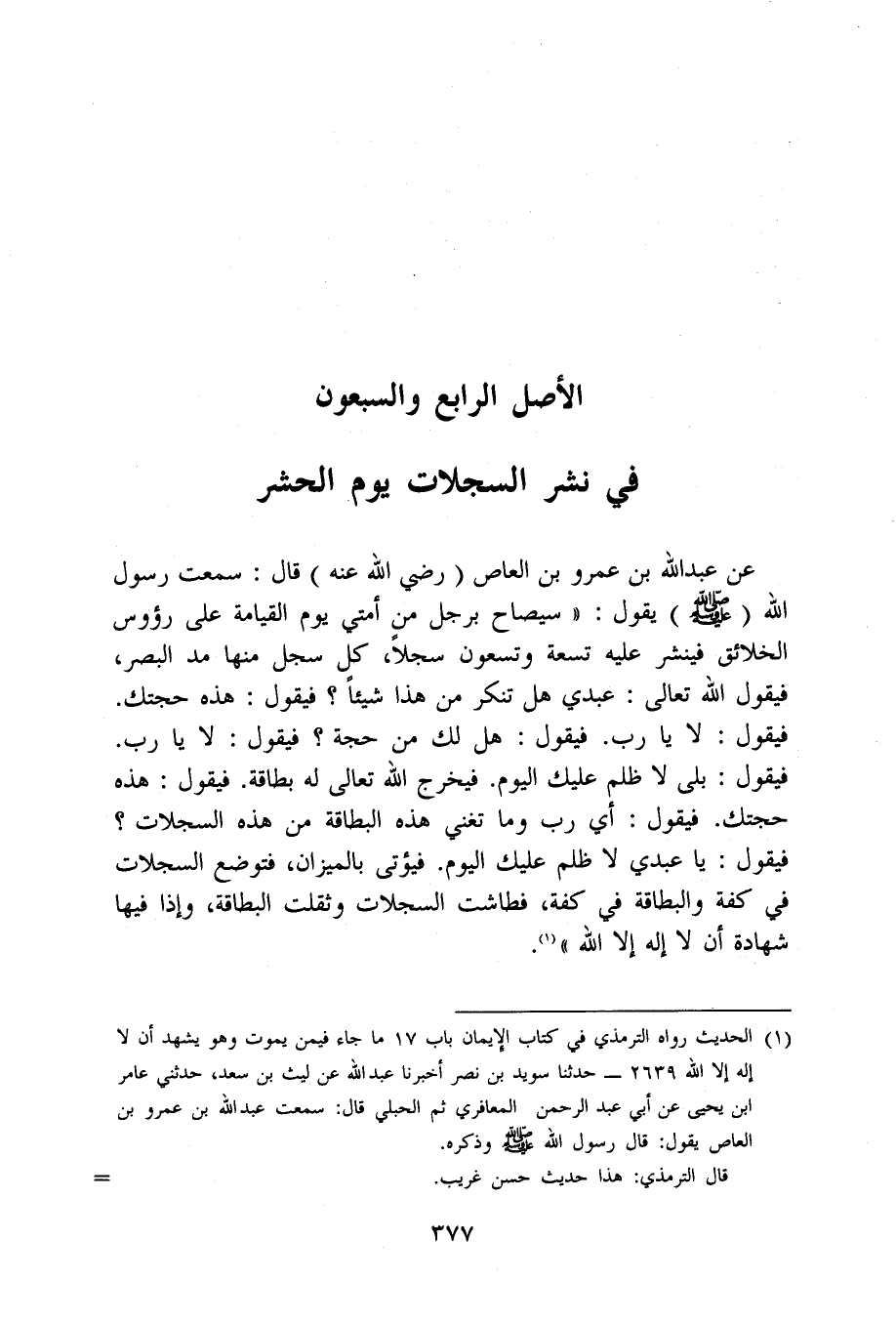 عَن عبد الله بن عَمْرو بن الْعَاصِ رَضِي الله عَنهُ قَالَ سَمِعت رَسُول الله صلى الله عَلَيْهِ وَسلم يَقُول سيصاح بِرَجُل من أمتِي يَوْم الْقِيَامَة على رُؤُوس الْخَلَائق فينشر عَلَيْهِ تِسْعَة وَتسْعُونَ سجلا كل سجل مِنْهَا مد الْبَصَر فَيَقُول الله تَعَالَى عَبدِي هَل تنكر من هَذَا شَيْئا فَيَقُول هَذِه حجتك فَيَقُول لَا يَا رب فَيَقُول هَل لَك من حجَّة فَيَقُول لَا يَا رب فَيَقُول بلَى لَا ظلم عَلَيْك الْيَوْم فَيخرج الله تَعَالَى لَهُ بطاقة فَيَقُول هَذِه حجتك فَيَقُول أَي رب وَمَا تغني هَذِه البطاقة من السجلات فَيَقُول يَا عَبدِي لَا ظلم عَلَيْك الْيَوْم فَيُؤتى بالميزان فتوضع السجلات فِي كفة والبطافة فِي كفة فطاشت السجلات وثقلت البطاقة وَإِذا فِيهَا شَهَادَة أَن لَا إِلَه إِلَّا الله