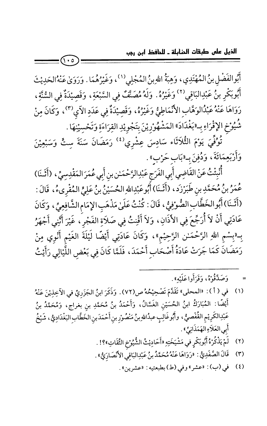 أُنبِئْتُ عن القاضي أبي الفرج عبد الرحمن بن أبي عمر المقدسي، أَنْبَأَنَا عمر بن محمد بن طَبَرْزَد، أبنأنا أَبُو عبد الله الحسين بن علي المقرىء قَالَ: أَنْبَأَنَا أَبُو الخطاب الصوفي قَالَ: كنت على مذهب الإمام الشافعي، وكان عادتي: أن لا أرجّعَ في الأذان، ولا أقنت في صلاة الفجر، غير أنني أجهر ببسم الله الرحمن الرحيم. وكان عادتي أيضا ليلة الغيم: أنوي من رمضان كما جرت عادة أصحاب أحمد، فلما كان في بعض الليالي: رأيت