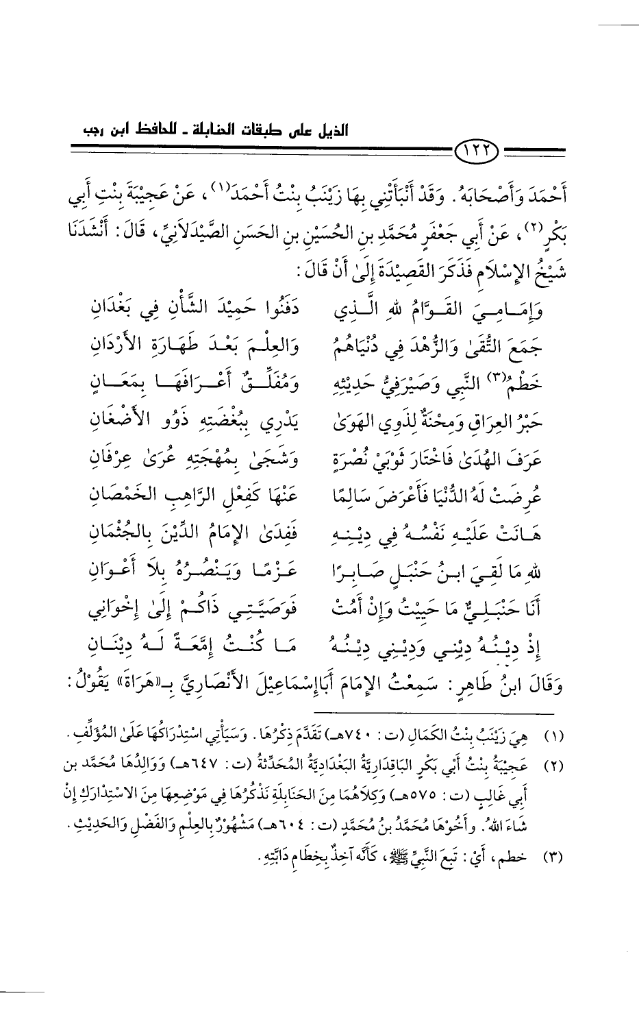 أحمد وأصحابه. وقد أنبأتني بها زينب بنت أحمد، عن عجيبة بنت أَبِي بَكْرٍ، عن أبي جعفر محمد بن الحسين بن الحسن الصيدلاني. قَالَ: أنشدنا شيخ الإسلام فذكر القصيدة إلى أن قَالَ: