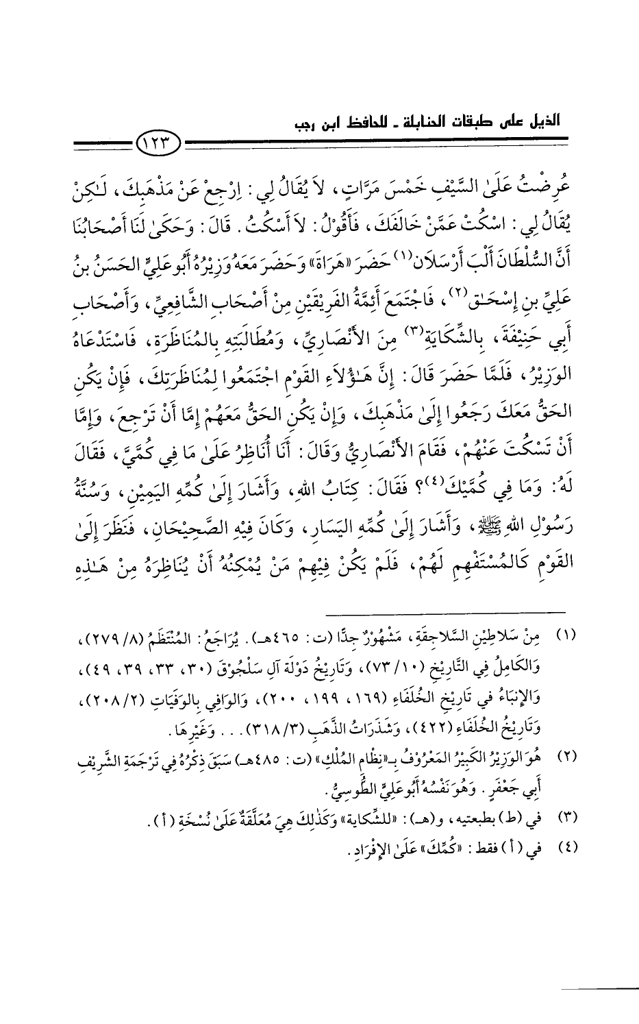 قال: وحكى لنا أصحابنا أن السلطان " ألب أرسلان " حضر هراة، وحضر معه وزيره أَبُو علي الحسن بن علي بن إسحاق، فاجتمع أئمة الفريقين من أصحاب الشافعي، وأصحاب أبي حنيفة، للشكاية من الأنصاري، ومطالبته بالمناظرة. فاستدعاه الوزير. فلما حضر قَالَ: إن هؤلاء القوم اجتمعوا لمناظرتك: فإن يكن الحق معك رجعوا إلى مذهبك، وإن يكن الحق معهم: إما أن ترجع، وإما أن تسكت عنهم. فقام الأنصاري وقال: أنا أناظر على ما في كمَّيَّ. فقال له: وما في كميك؟ فقال: كتاب الله، وأشار إلى كمه اليمين، وسنة رَسُول اللَّهِ صَلَّى اللَّهُ عَلَيْهِ وَسَلَّمَ، وأشار إلى كمه اليسار، وكان فيه الصحيحان. فنظر إلى القوم كالمستفهم لهم، فلم يكن فيهم من يمكنه أن يناظره من هذه