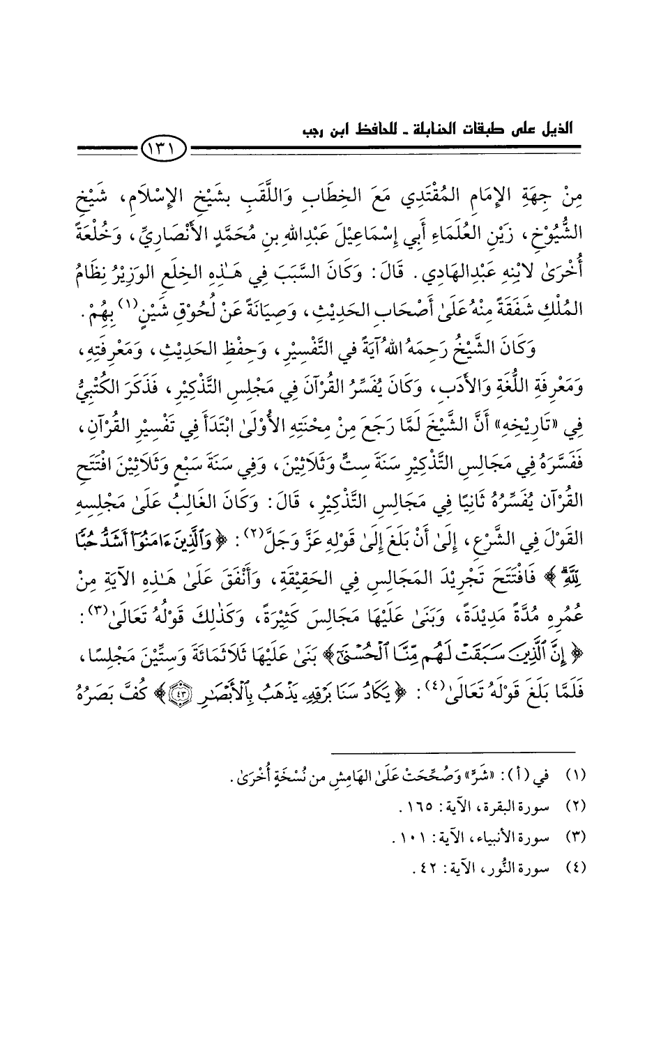 قال: وكان الغالب على مجلسه القول في الشرع، إلى أن بلغ إلى قوله عزَّ وَجَل: " والَذِينَ آمَنُوا أَشَذ حُبًّا لله " آل عمران: ١٦٥. فافتتح تجريد المجالس في الحقيقة، وأنقق على هذه الآية من عمره مدة مديدة، وبنى عليها مجالس كثيرة. وكذلك قوله تعالى: " إنَّ الَذِينَ سَبَقَتْ لَهُمْ مِنَّا الْحُسْنَى " الأنبياء: ١٠١، بنى عليها ثلاثمائة وستين مجلسا. فلما بلغ قوله تعالى: " يَكَادُ سَنَا بَرْقه يَذْهَبُ بِالأَبْصَارٍ " النور: ٤٣، كُفَ بَصَرُه