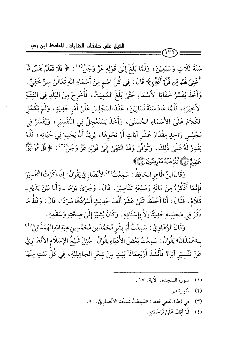 سنة ثلاث وسبعين، ولما بلغ إلى قوله عز وجل: " فَلاَ تَعْلمُ نَفْسٌ مَا أُخْفيَ لَهُمْ مِنْ قرَةِ أَعْينٍ ". السجدة: ١١٧ قَالَ: في كل اسم من أسماء الله تعالى سر خفي. وَأخَذَ يُفسِّر خفايا الأسماء حتى بلغ المميت، فأُخرج من البلد في الفتنة الأخيرة. فلما عاد سنة ثمانين، عقد المجلس على أمر جديد، ولم يكمل الكلام على الأسماء الحسنى. وأخذ يستعجل في التفسير، ويفسر في مجلس واحد مقدار عشر آيات أو نحوها، يريد أن يختم في حياته، فلم يقدر له على ذلك وتوفي، وقد انتهى إلى قوله عزَ وجل: " قُلْ: هُوَ نَبَأّ عَظِيمٌ. أنتمْ عَنْهُ مُعْرِضُونَ " ص: ٦٧، ٦٨،.