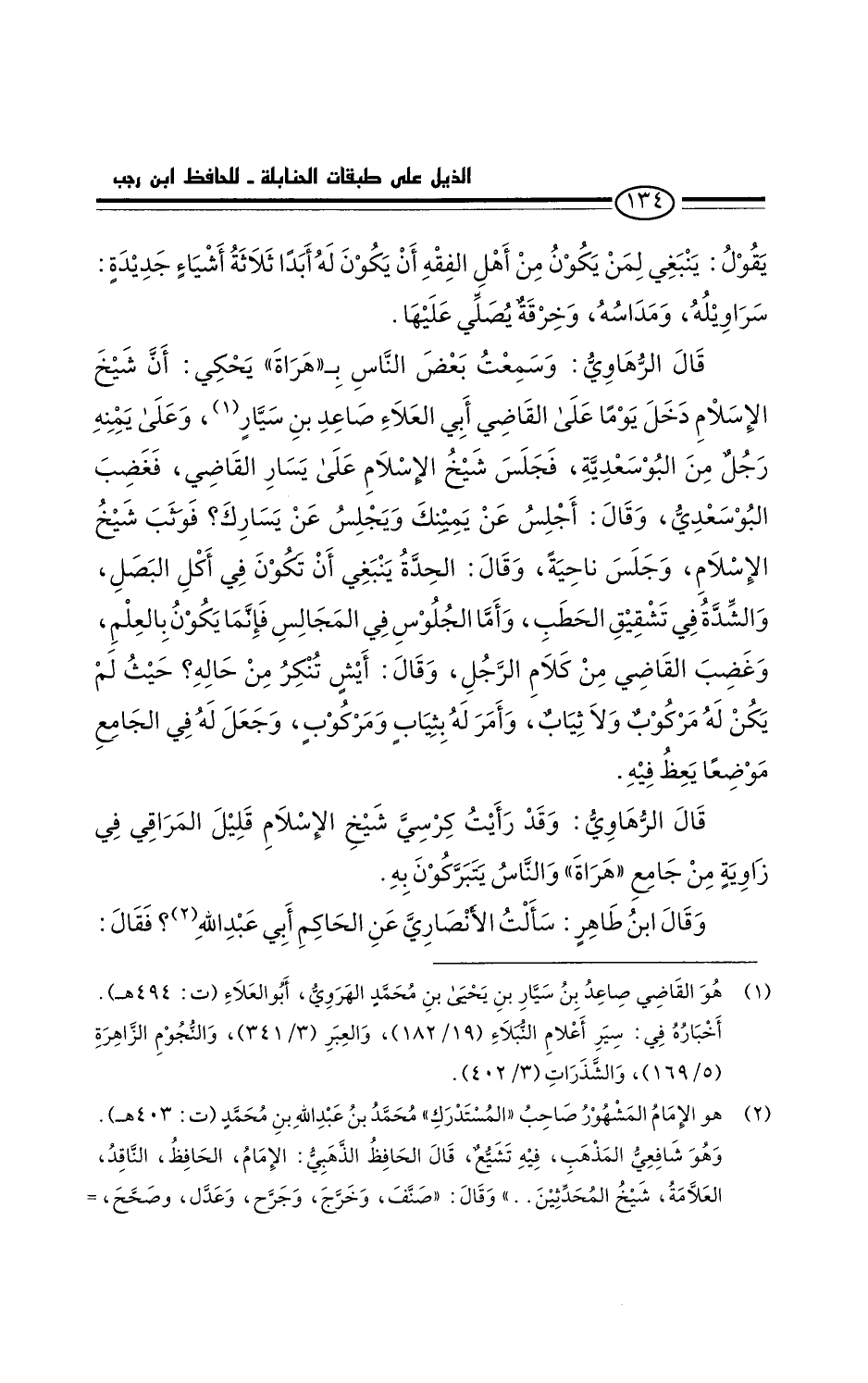قال الرُّهاوي: وسمعتُ بعض الناس بهراة يحكي: أن شيخ الإسلام دخل يوما على القاضي أبي العلاء صاعد بن سيار، وعلى يمينه رجل من البُوسَعْدِية، فجلس شيخ الإسلام على يسار القاضي، فغضب البوسعدي، وقال: أجلسُ عن يمينك ويجلسُ عن يسارك. فوثب شيخ الإسلام، وجلس ناحية، وقال: الحِدّةُ ينبغي أن تكون في، أكل البصل، والشدة في تشقيق الحطب. وأما الجلوس في المجالس فإنما يكون بالعلم. وغضب القاضي من كلام الرجل، وقال: إيش تنكر من حاله؟ حيث لم يكن له مركوب ولا ثياب، وأمر له بثياب ومركوب، وجعل له في الجامع موضعا يعظُ فيه.