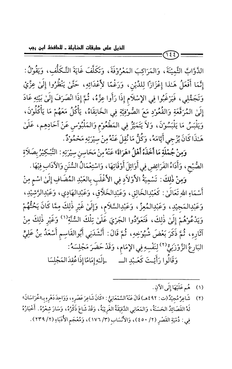 الدواب الثمينة، والمراكب المعروفة، وتكلَّف غاية التكلف، ويقول: إنما أفعلُ هذا إعزازا للدَّين، ورغما لأعدائه، حتى ينظروا إلى عزِّي وتجملي، فيرغبوا في الإسلام إذا رأوا عزه. ثم إذا انصرف إلى بيته عاد إلى المرقعة والقعود مع الصوفية في الخانقاه، يأكل معهم ما يأكلون، ويلبسُ ما يلبسون، ولا يتميز في المطعوم والملبوس عن اَحادهم. على هذا كان يزجي أيامه. وكل ما نقل عنه من سيرته محمود.