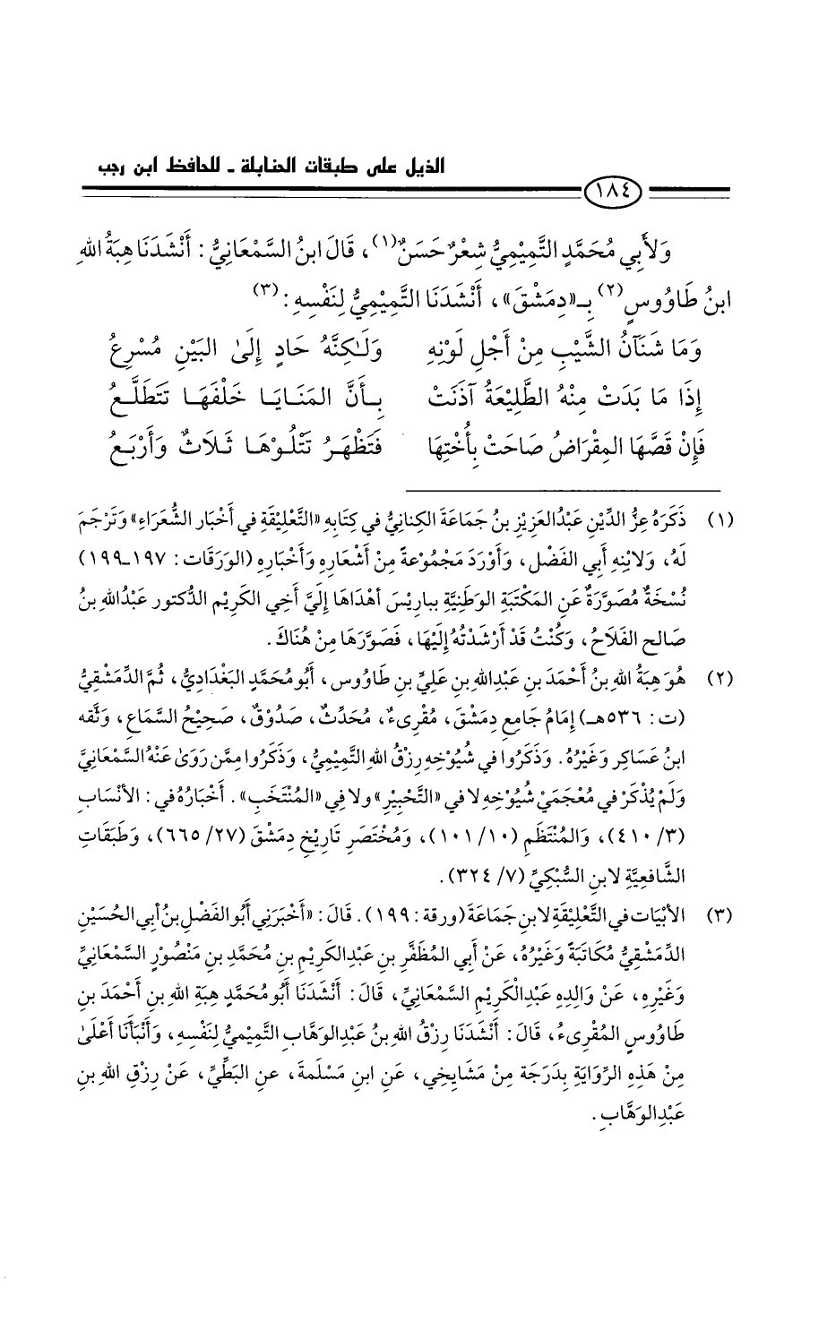 ولأبي محمد التميمي شعرٌ حسن. قَالَ ابن السمعاني: أنشدنا هبةُ الله بن طاوس بدمشق، أنشدنا التميمي لنفسه: