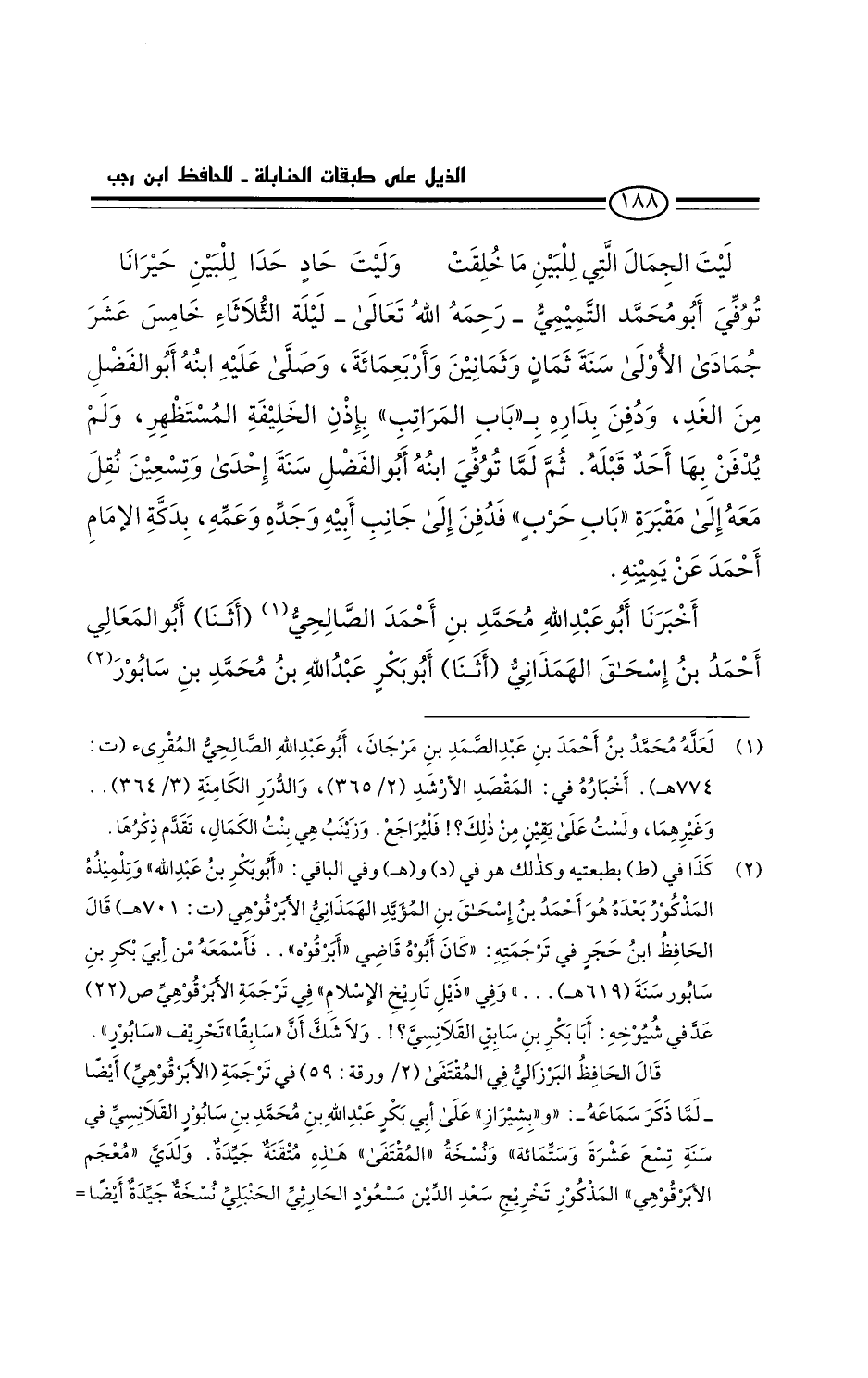 ثم لما توفي ابنه أَبُو الفضل سنة إحدى وتسعين، نقل معه إلى مقبرة باب حرب، فدُفِن إلى جانب أبيه وجده وعمه، بدكة الإمام أحمد عن يمينه.