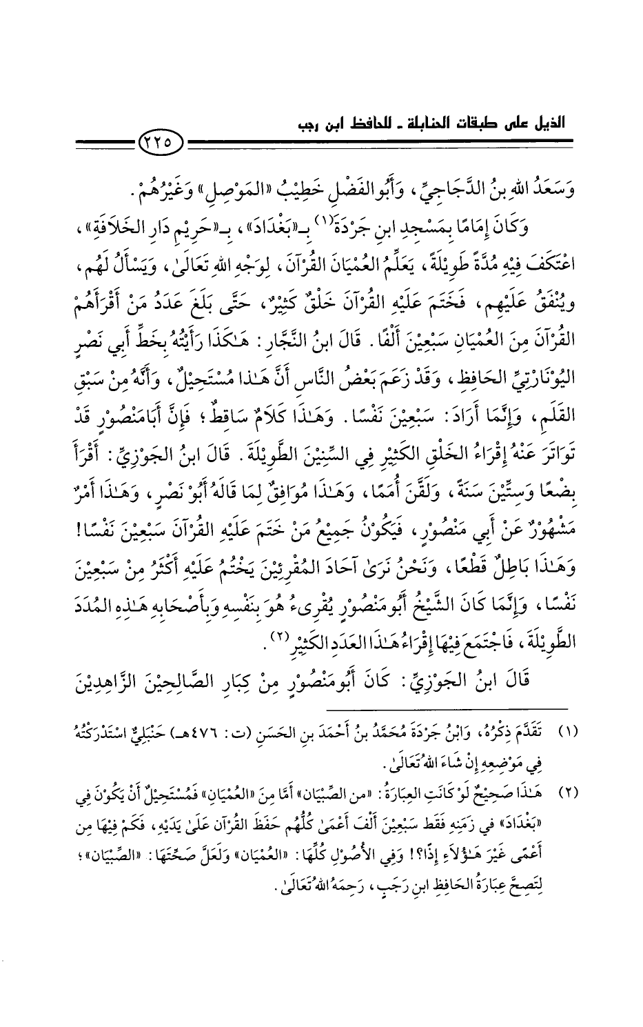 قال ابن النجار: هكذا رأيتُه بخطأبي نصر اليونارتي الحافظ. وقد زعم بعض الناس أن هذا مستحيل، وأنه من سبق القلم. وإنما أراد: سبعين نفسا. وهذا كلام ساقط فإن أبا منصور قد تواتر عنه إقراء الخلق الكثير في السنين الطويلة.