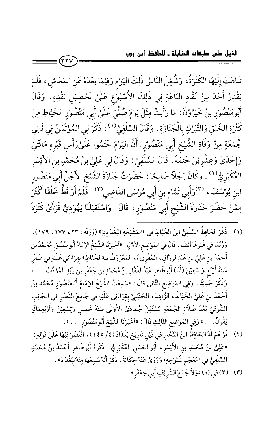 وقال أَبُو منصور بن خيرون: ما رأيتُ مثل يوم صُلي على أبي منصور الخياط، من كثرة الخلق والتبرك بالجنازة.