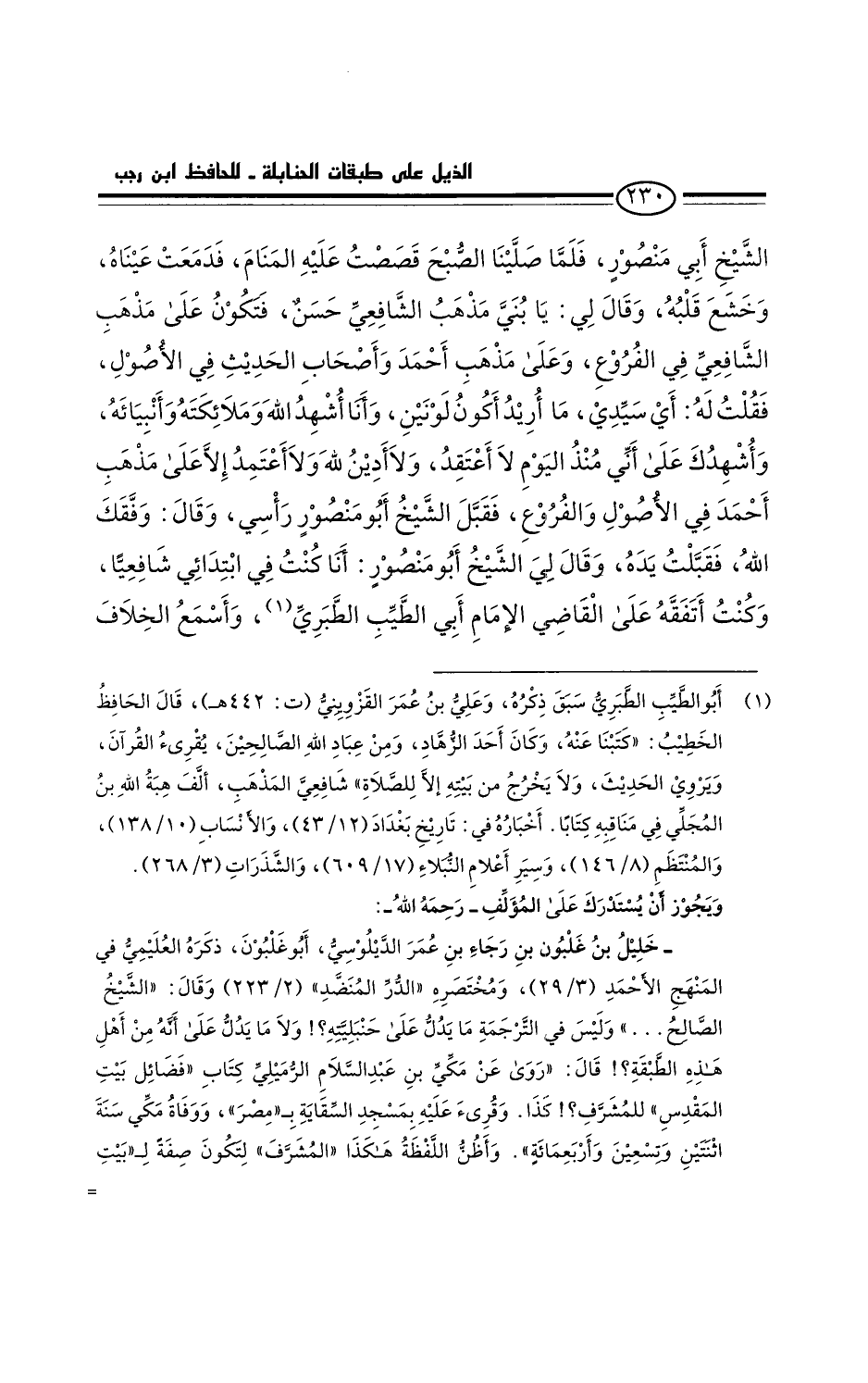 الشيخ أبي منصور. فلما صلينا الصبح قصصتُ عليه المنام، فدمعت عيناه، وخشع قلبُه، وقال لي: يا بُني، مذهبُ الشافعي حسن، فتكون على مذهب الشافعي في الفروع، وعلى مذهب أحمد وأصحاب الحديث في الأصول، فقلت له: أي سيدي، ما أريد أكون لونين. وأنا أشهد الله وملائكته وأنبيائه، وأشهدُك على أني مُنذ اليوم لا أعتقد ولا أدين الله ولا أعتمدُ إلا على مذهب أحمد في الأصول والفروع. فقبَّل الشيخ أَبُو منصور رأسي، وقال: وفقك الله، فقبَّلتُ يدَه.