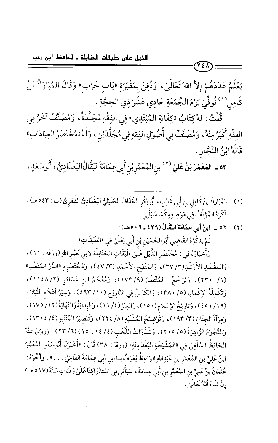 قلتُ: له كتاب " كفاية المبتدي " في الفقه مجلدة، ومصنف آخر في الفقه أكبر منه، ومصنف في أصول الفقه في مجلدين، وله " مختصر العبادات ". قاله ابن النجار.