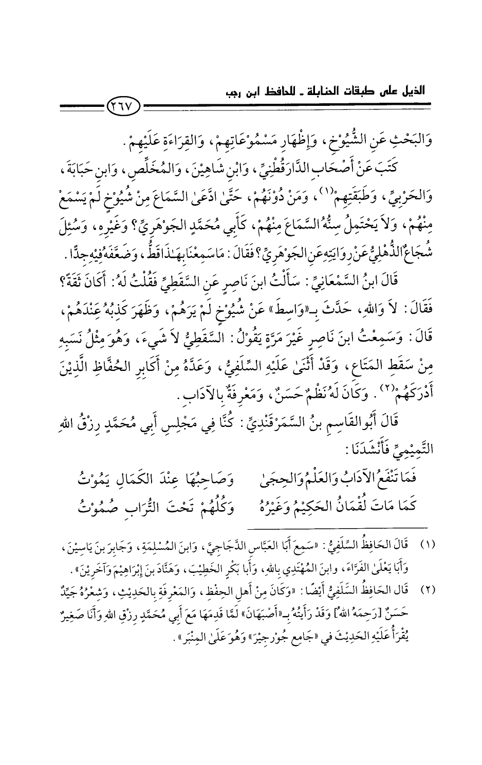 قال: وسمعتُ ابن ناصر غَيَرَ مِرَّة يقول: السقطي لا شيء، وهو مثل نسبه من سقط المتاع. وقد أثنى عليه السلفي، وعده من أكابر الحفاظ الَذين أدركهم. وكان له نظم حسن، ومعرفة بالأدب.