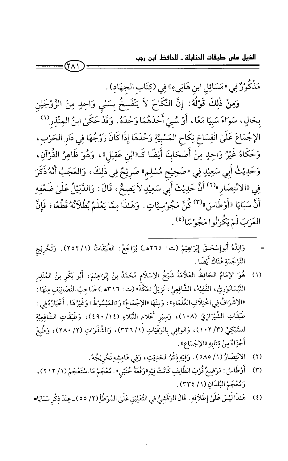 ومن ذلك قوله: إن النكاح لا ينفسخ بسبي واحدٍ من الزوجين بحال، سواء سُييَا معا أو سُبِيَ أحدهما وحده. وقد حكى بن المنذر الإجماع على انفساخ نكاح المسيبة وحدها إذا كان زوجها في دار الحرب. وحكاه غير واحدٍ من أصحابنا أيضا كابن عقيل. وهو ظاهر القرآن. وحديثُ أبي سعيد في صحيح مسلم صريحٌ في ذلك. والعجب أنه ذكر في الانتصار: أن حديث أبي سعيد لا يصح. قَالَ: والدليل على ضعفه أن سبايا أوطَاسٍ كُنَّ مجُوسيات. وهذا مما يعلم بطلانه قطعا فإن العرب لم يكونوا مجوسا.