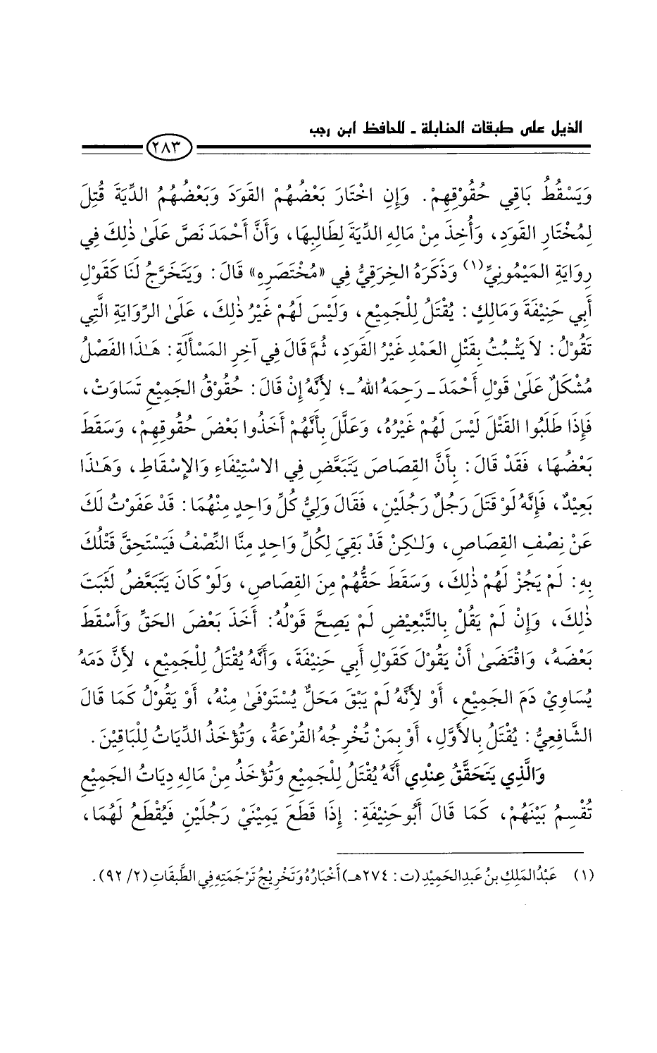 ثم قَالَ في آخر المسألة: هذا الفصلُ مشكل على قول أحمد رحمه الله لأنه إن قَالَ: حقوقُ الجميع تساوتْ، فإذا طلبوا القتلَ ليس لهم غيره. وعلل بأنهم أخذوا بعض حقوقهم، وسقط بعضها. فقد قَالَ: بأن القصاص يتَبعّضُ في الاستيفاء والإسقاط. وهذا بعيد. فإنه لو قتل رجلٌ رجلين، فقال ولي كل واحدٍ منهما: قد عَفَوْتُ لك عن نصف القصاص، ولكن قد بقي لكل واحدٍ منَّا النصف فيستحق قتلك به: لم يجُز لهم ذلك، وسقط حقهم من القصاص. ولو كان يتبعض لثبت ذلك. وإن لم يقل بالتبعيض لم يصح قوله: أخذ بعض الحق وأسقط بعضه. واقتضى أن يقول كقول أبي حنيفة، وأنه يُقتل للجميع، لأن دمه يساوي دَم الجميع، أو لأنه لم يبقَ محل يستوفي منه، أو يَقُول كما قَالَ الشافعي: يُقتَل بالأول أو بمن تخرجُه القرعة وتؤخذ الديات للباقين.