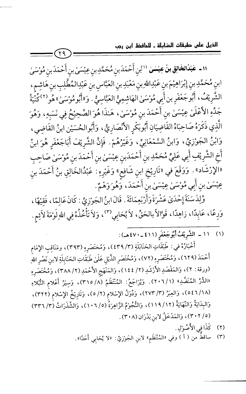 هذا هو الصحيحُ في نسبه. وهو الذي ذكره صاحباه القاضيان: أَبُو بَكْرٍ الأنصاري، وأَبُو الحسين بن القاضي، وابن الجوزي، وابن السمعاني، وغيرهم. فإن الشريف أبا جعفر هو ابن أخ الشريف أبي علي محمد بن أحمد بن محمد بن عيسى بن أحمد بن موسى صاحب " الإرشاد ".