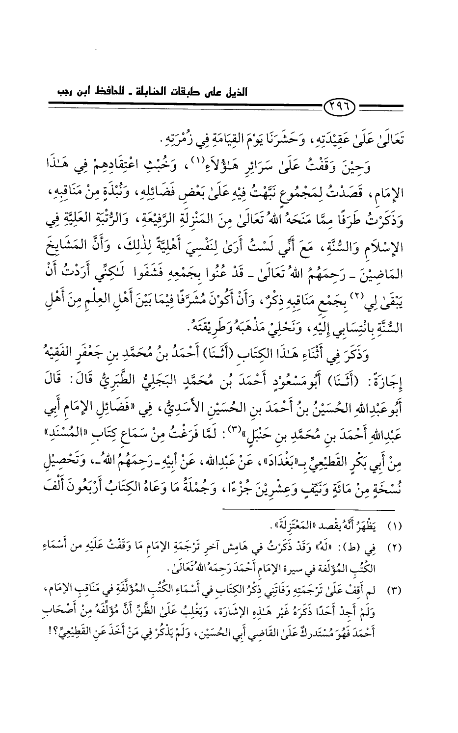 وذكر في أثناء هذا الكتاب: أَخْبَرَنَا أحمد بن محمد بن جعفر الفقيه إجازة: أَخْبَرَنَا أَبُو مسعود أحمد بن محمد البجلي الطبري قَالَ: قَالَ أَبُو عبد الله الحسين بن أحمد بن الحسين الأسدي، في فضائل الإمام أبي عبد الله أحمد بن محمد بن حنبل: لما فرغتُ من سماع كتاب المسند من أَبِي بَكْرٍ القطيعي ببغداد، عن عبد الله عن أبيه رحمهم الله. وتحصيل نسخة من مائة ونيف وعشرين جزءًا، وجملة ما وعاه الكتاب أربعون ألف