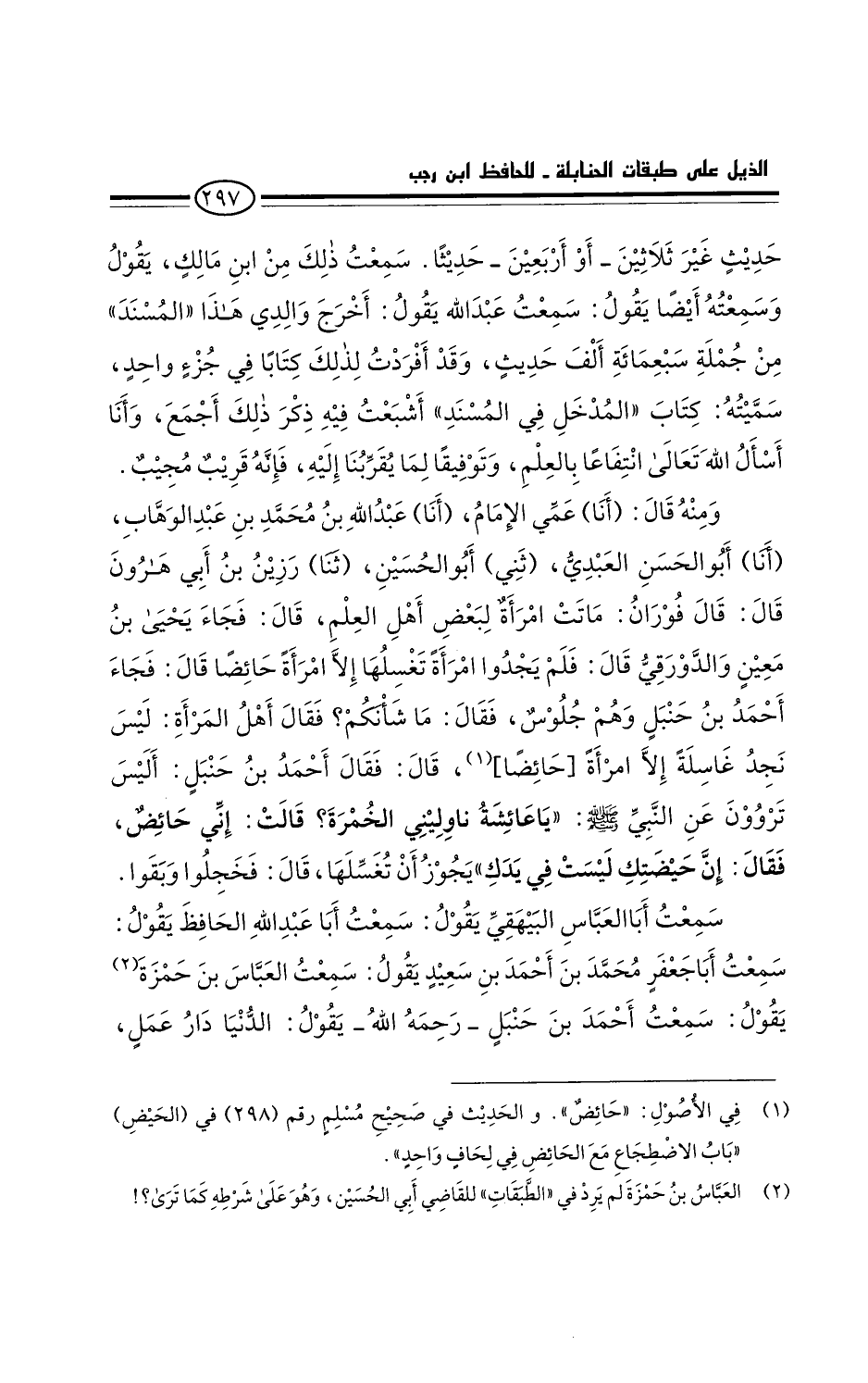 وَمِنْهُ قَالَ: أَخْبَرَنَا عَمِّي الإِمَامُ، أَخْبَرَنَا عَبْدُ اللَّهِ بْنُ مُحَمَّدِ بْنِ عَبْدِ الْوَهَّابِ، أَخْبَرَنَا أَبُو الْحَسَنِ الْعَبْدِيُّ، حَدَّثَنِي أَبُو الْحُسَيْنِ، حَدَّثَنَا رُزَيْنُ بْنُ أَبِي هَارُونَ قَالَ: قَالَ فُورَانُ: ماتتْ امْرَأَةٌ لِبَعْضِ أَهْلِ الْعِلْمِ، قَالَ: فَجَاءَ يَحْيَى بْنُ مَعِينٍ وَالدَّوْرَقِيُّ. قَالَ: فَلَمْ يَجِدُوا امْرَأَةً تغسلها إلا امرأة حائض. قَالَ: فجَاء أَحْمَدُ بْنُ حَنْبَلٍ، وَهُمْ جُلُوسٌ، فَقَالَ: مَا شَأْنُكُمْ؟ فَقَالَ أَهْلُ الْمَرْأَةِ: لَيْسَ نَجِدُ غاسلة إلا امرأة حَائض، قَالَ: فَقَالَ أَحْمَدُ بْنُ حَنْبَلٍ: أَلَيْسَ تَرْوُونَ عَنِ النَّبِيِّ صَلَّى اللَّهُ عَلَيْهِ وَسَلَّمَ " يَا عَائِشَةَ، ناوِليني الْخُمْرَةَ. قَالَتْ: إِنِّي حَائِضٌ، فَقَال: إِنَّ حَيْضَتَكِ لَيْسَتْ فِي يَدَكِ " يجوزُ أَنْ تُغَسِّلَهَا. قَالَ: فَخَجَلُوا وَبَقُوا.