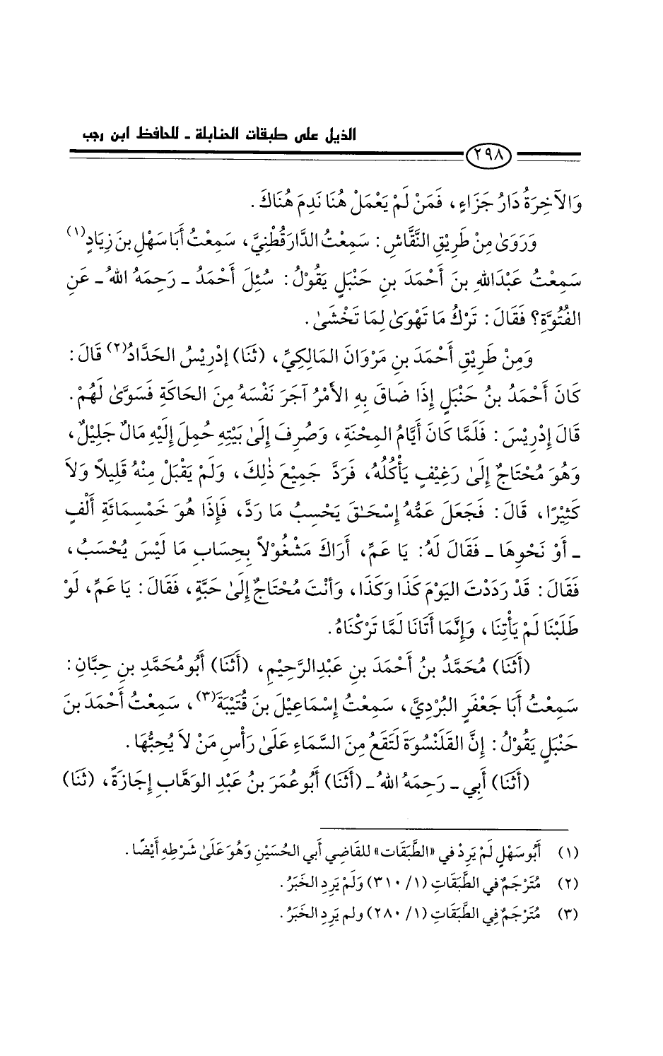 أَخْبَرَنَا محمد بن أحمد بن عبد الرحيم، أَخْبَرَنَا أَبُو محمد بن حبان: سمعتُ أبا جعفر البردي: سمعتُ إسماعيل بن قتيبة سمعتُ أحمد بن حنبل يقول: إن الْقَلَنْسُوَه لتقع من السماء على رأس من لا يحبُّها.