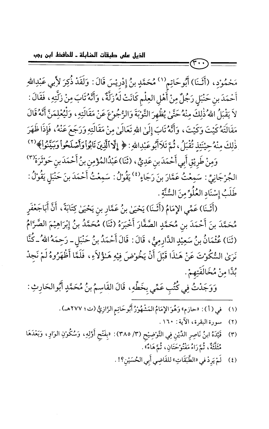 محمود، أَخْبَرَنَا أَبُو حاتم محمد بن إدريس قَالَ: ولقد ذكر لأبي عبد الله أحمد بن حنبل رجل من أهل العلم، كانت له زلة، وأنه تاب من زلته، فقال: لا يقبل الله ذلك منه حتى يظهر التوبة والرجوع عن مقالته، وليعلمن أنه قَالَ مقالته كيت وكيت، وأنه تاب إلى الله تعالى من مقالته، ورجع عنه، فإذا ظهر ذلك منه حينئذ تقبل، ثم تلا أَبُو عبد الله " إلاَّ االَذِينَ تَابُوا وَأَصْلَحُوا وَبَيَّنُوا " البقرة: ١٦٠.