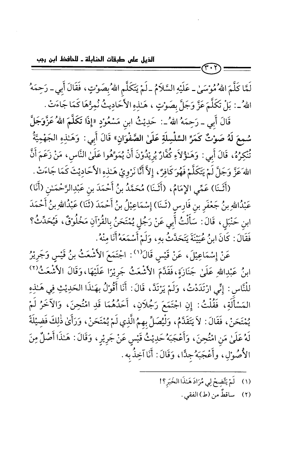 أَخْبَرَنَا عمي الإمام، أَخْبَرَنَا محمد بن أحمد بن عبد الرحمن، أَخْبَرَنَا عبد الله بن جعفر بن فارس، حَدَّثَنَا إسماعيل بن أحمد، حَدَّثَنَا عَبْدُ اللَّهِ بْنُ أَحْمَدَ بن حنبل، قَالَ: سألتُ أبي عن رجل يمتحن بالقرآن: مخلوق، فيحدث. فقالا: كان ابن عيينة يتحَدَّث به، ولم أسمعه أنا منه.